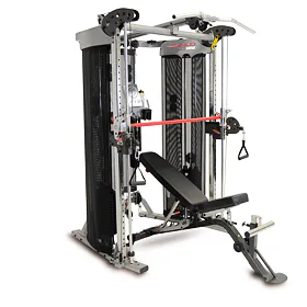 • multifunkční multipress s lavicí, výškově nastavitelné kladky, hrazda