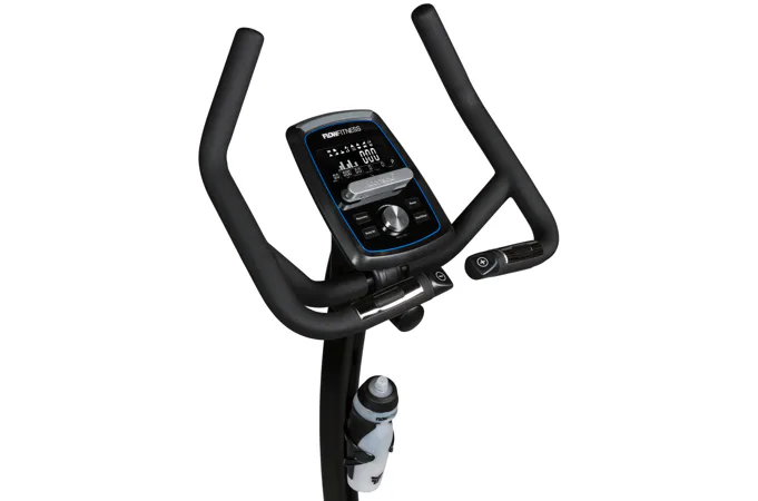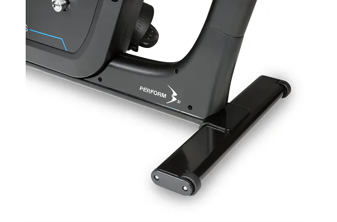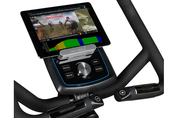 Součástí výbavy Flow Fitness B2i je počítač s držákem na tablet a bluetooth přijímačem, transportní kolečka, vyrovnávače nerovnosti a držák na lahev.
