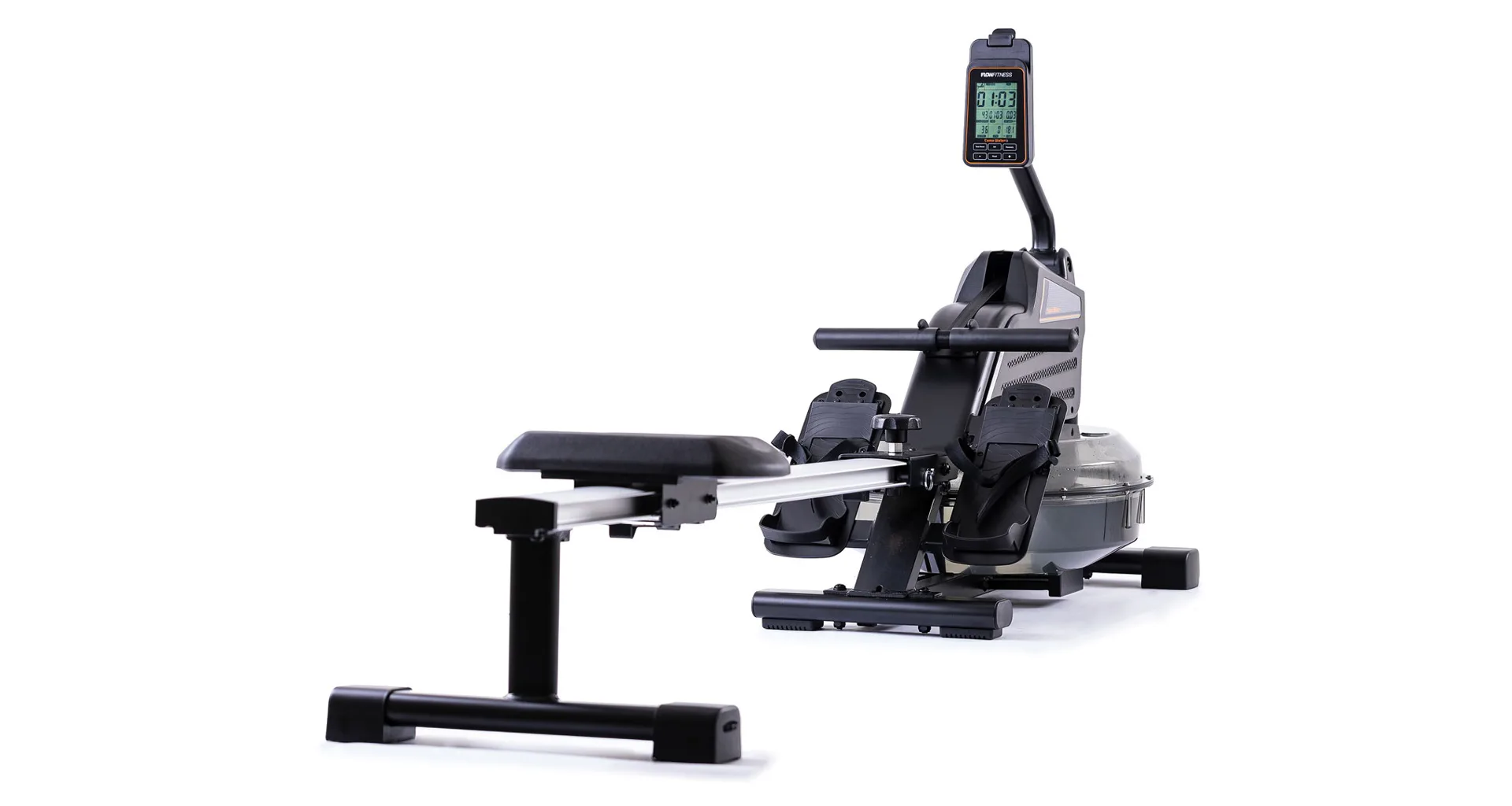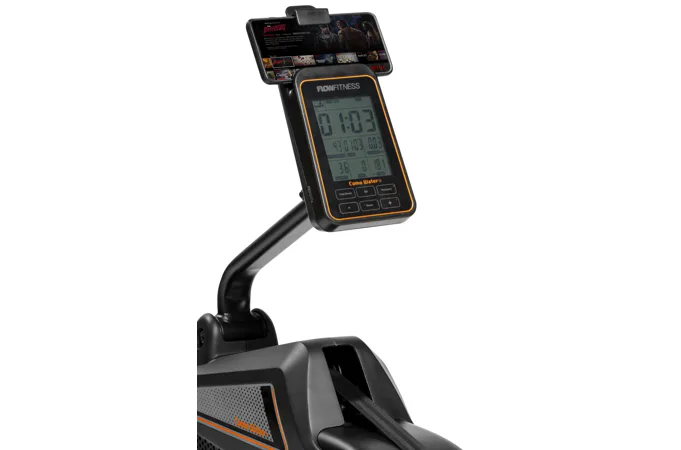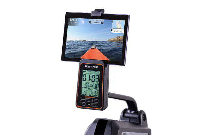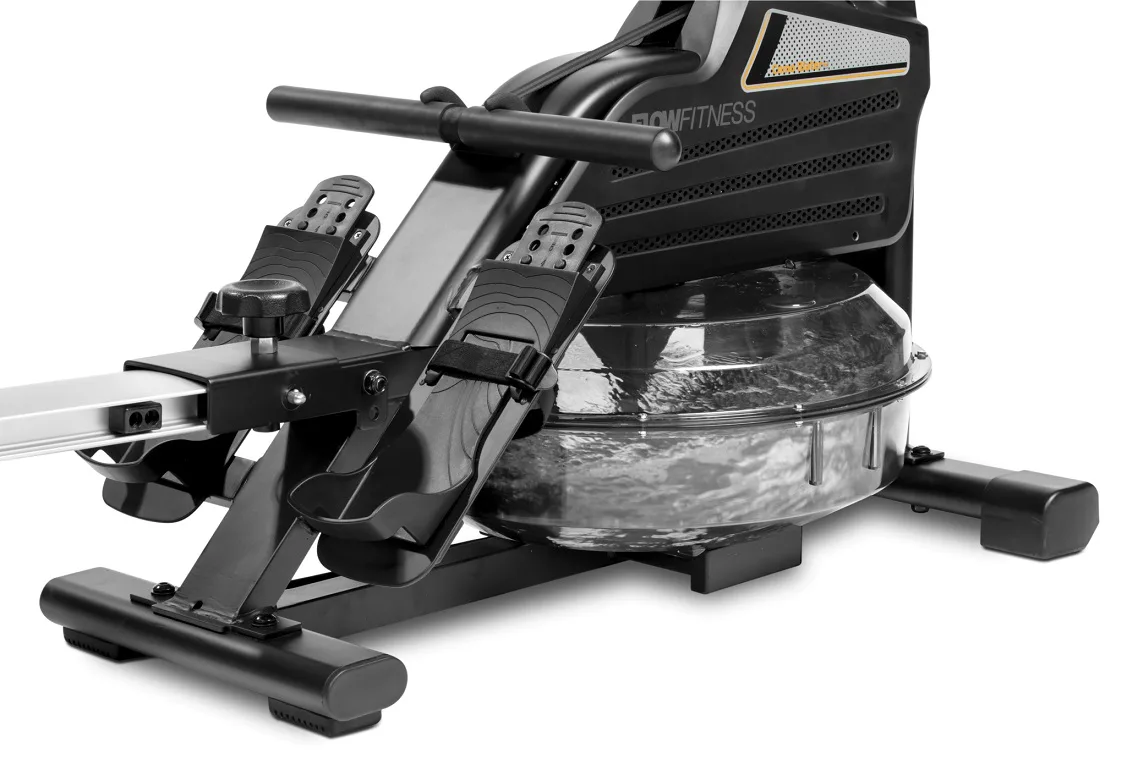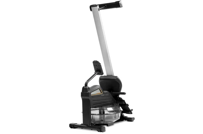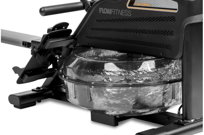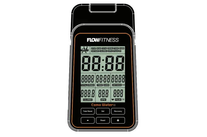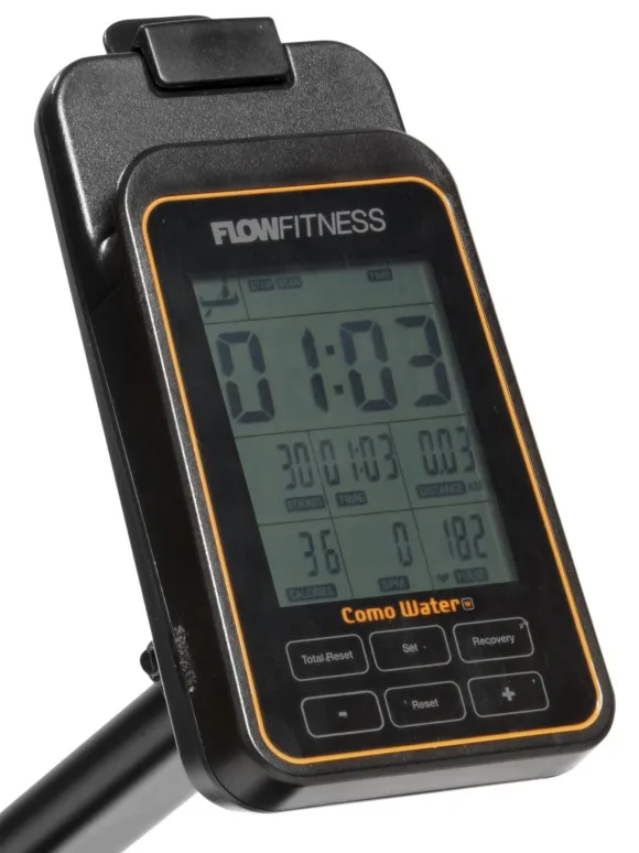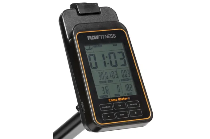 Veslovací trenažér Flow Fitness Como Water w disponuje přehledným počítačem, transportními kolečky, vyrovnávači nerovnosti a možností složení.