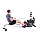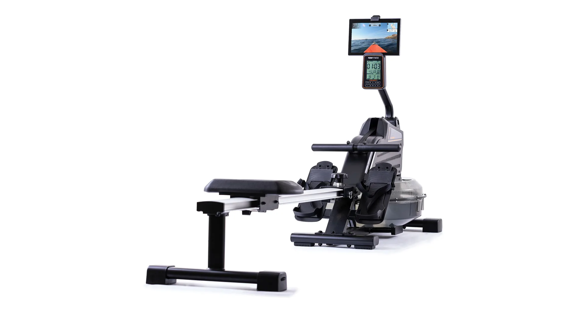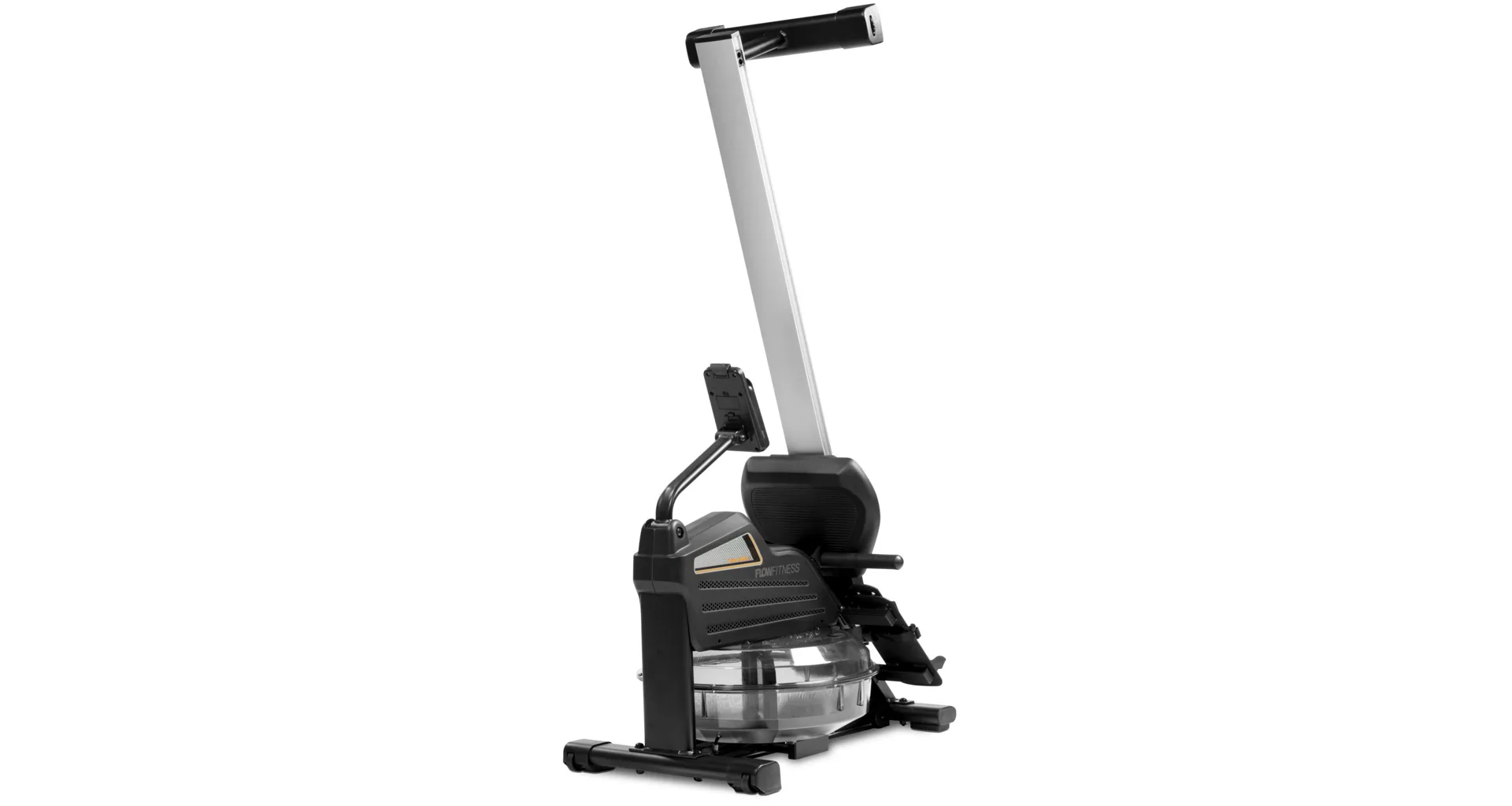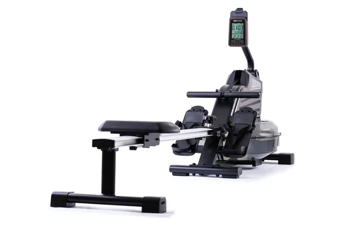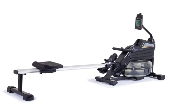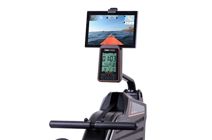 Veslovací trenažér Flow Fitness Como Water w disponuje přehledným počítačem, transportními kolečky, vyrovnávači nerovnosti a možností složení.