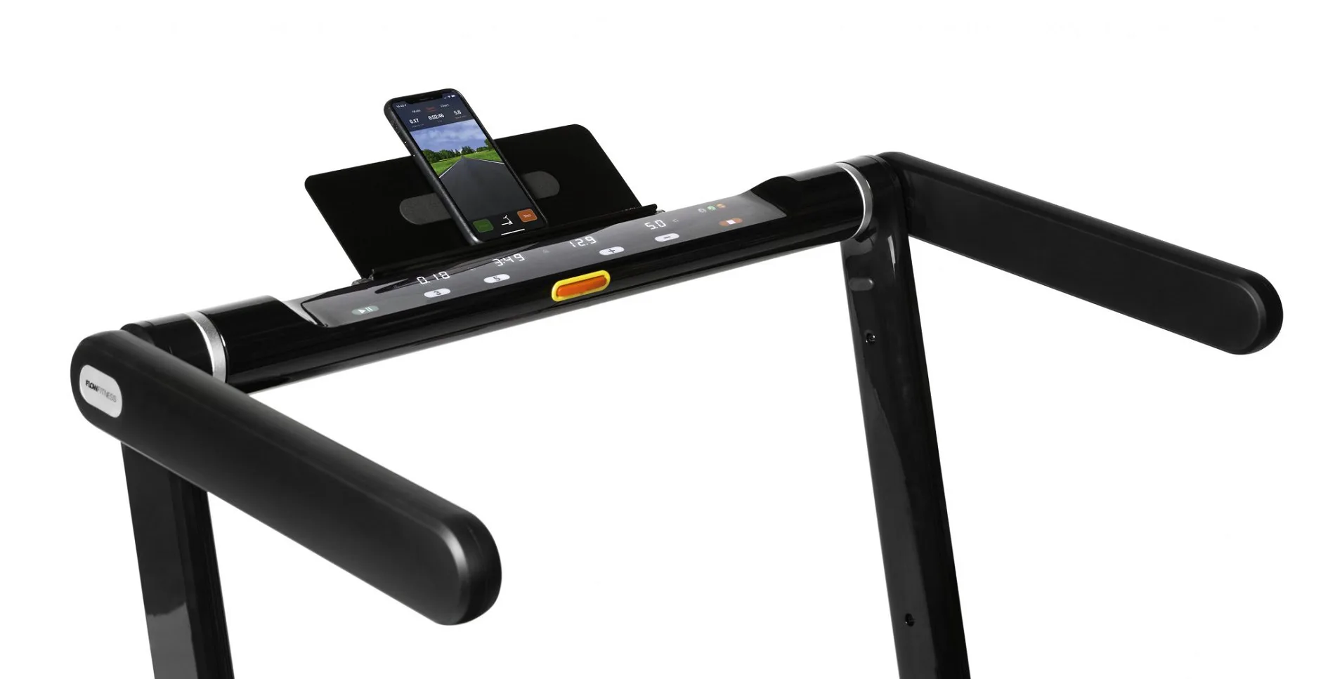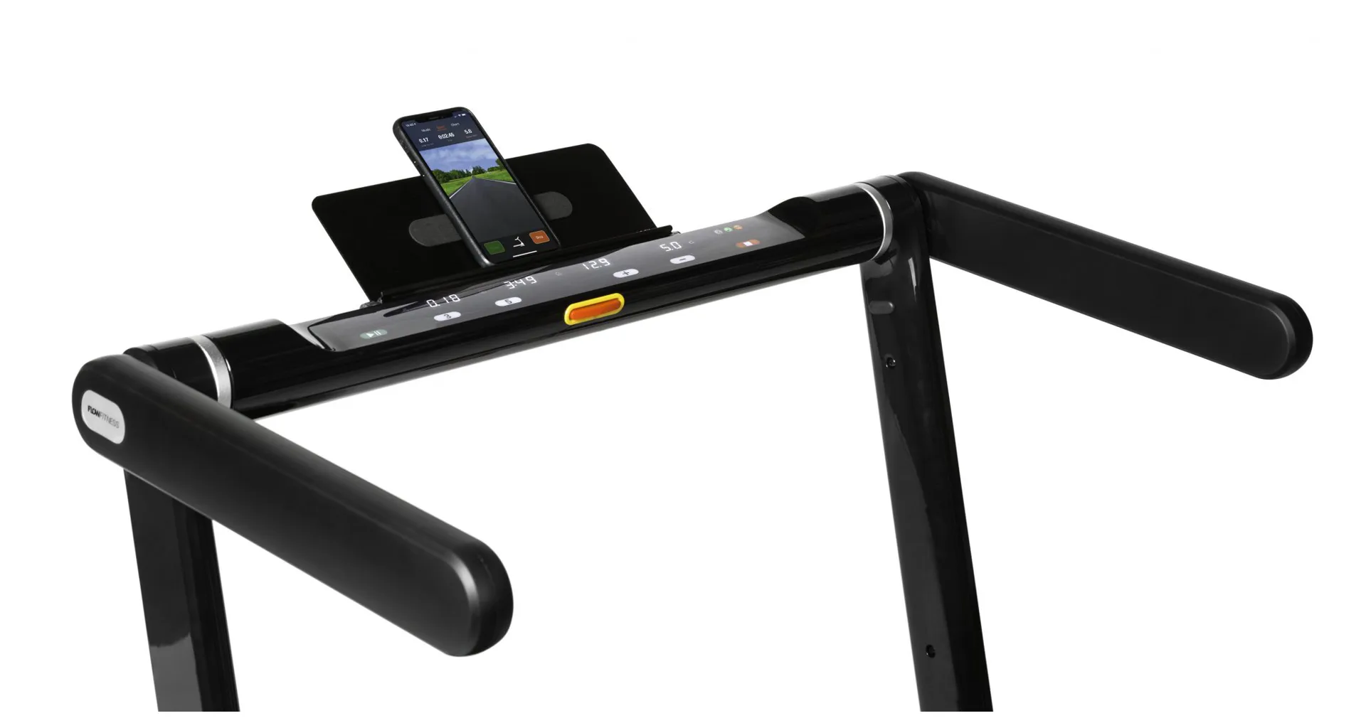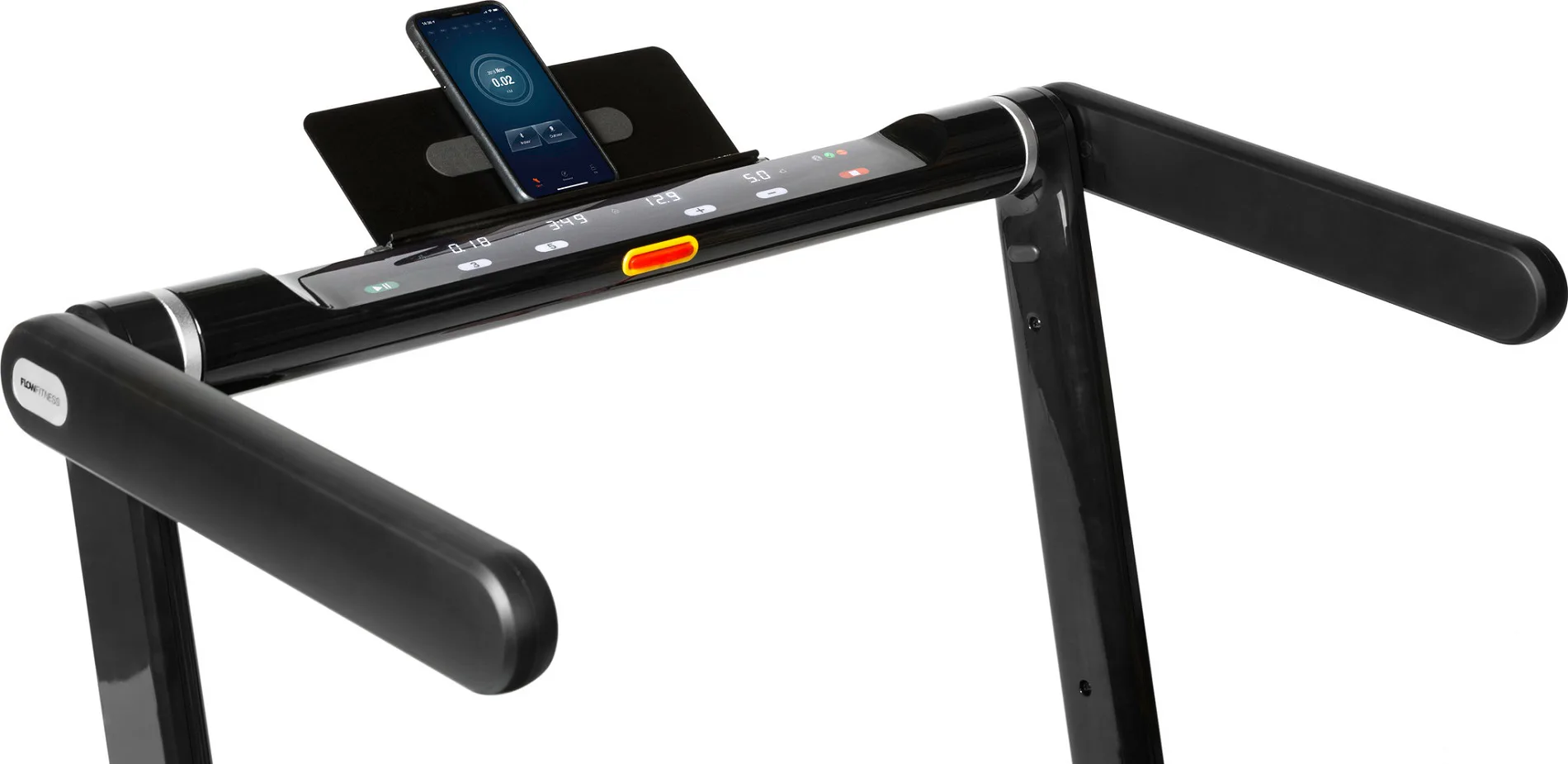 Běžecký pás Flow Fitness DTM3000i disponuje přehledným dotykovým displejem, držákem na tablet/smartphone, bluetooth přijímačem a transportními kolečky.
