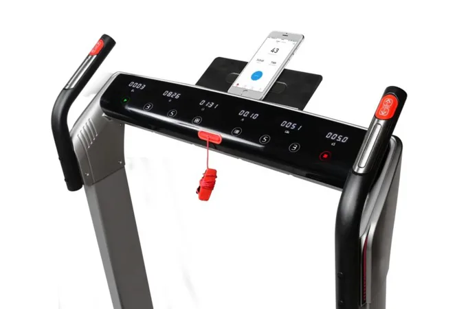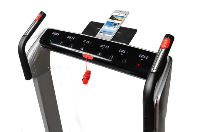Běžecký pás Flow Fitness DTM400i disponuje dotykovým displejem, držákem na tablet/smartphone, bluetooth přijímačem a transportními kolečky.