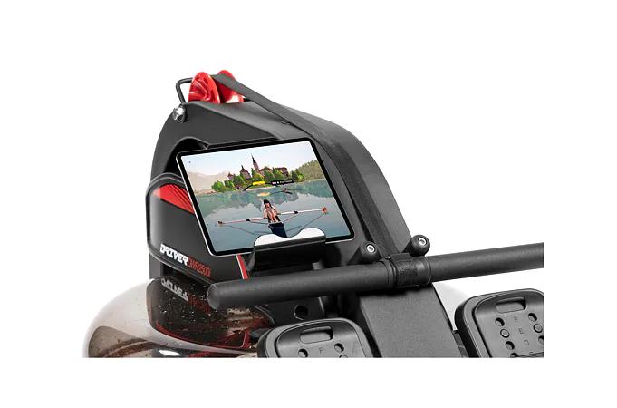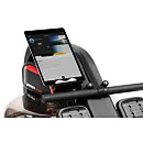 Veslo Flow Fitness DWR2500i také disponuje přehledným počítačem s držákem na tablet/smartphone, transportními kolečky, vyrovnávači nerovnosti a možností sklopení do vertikální polohy.