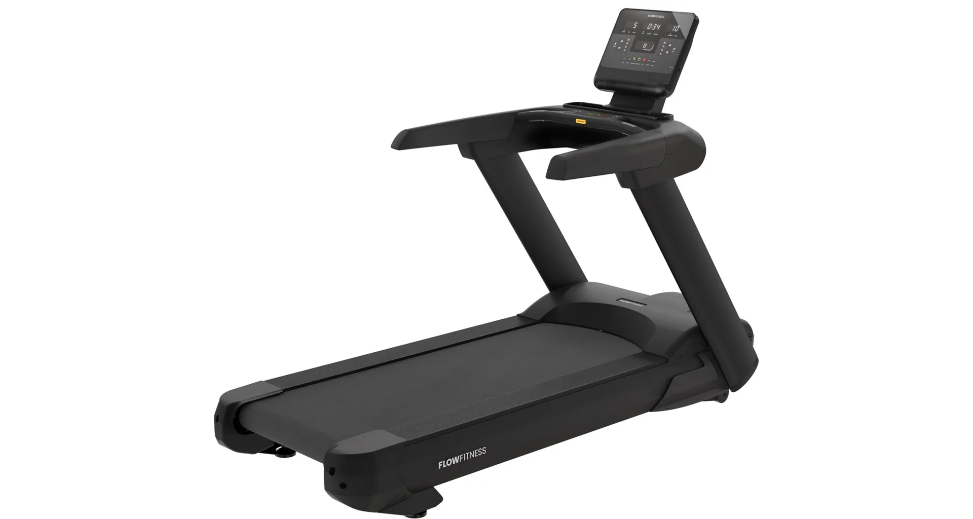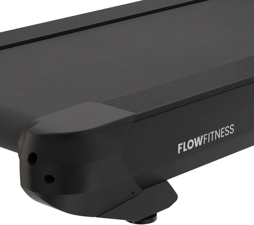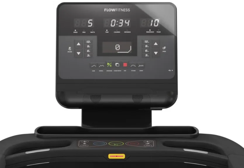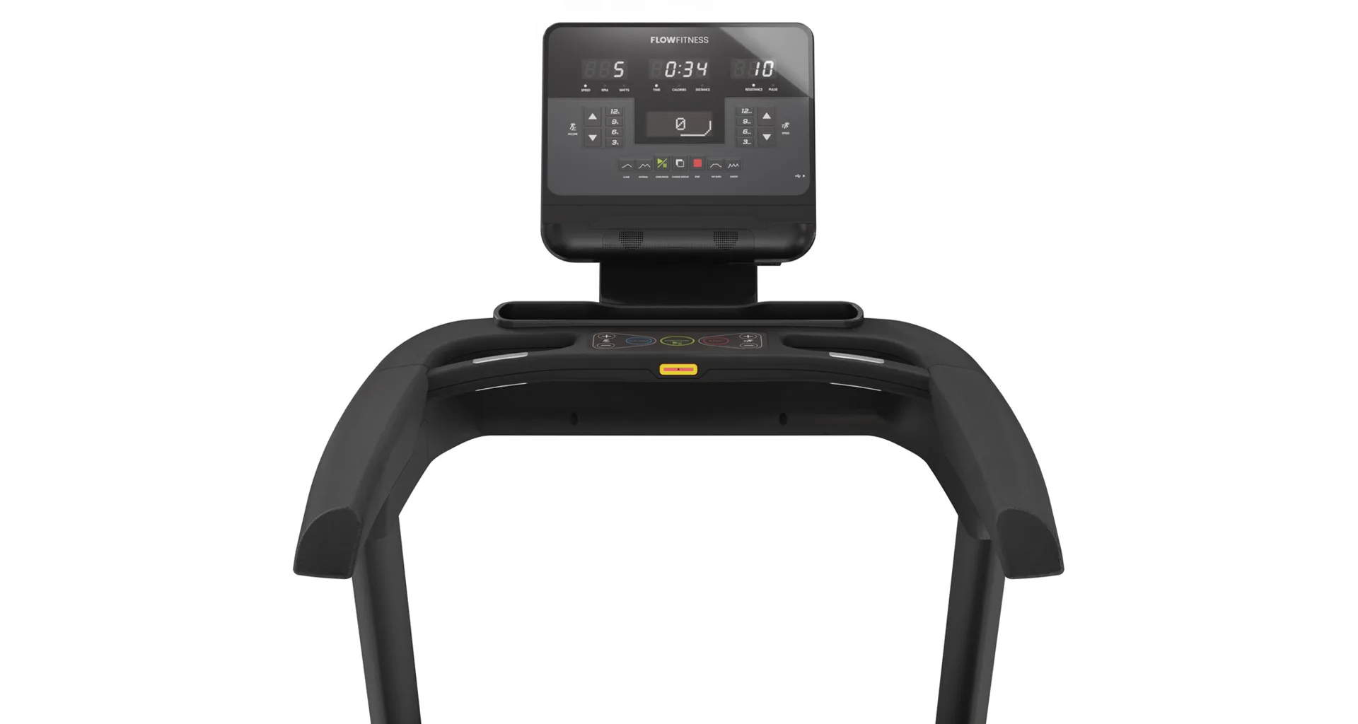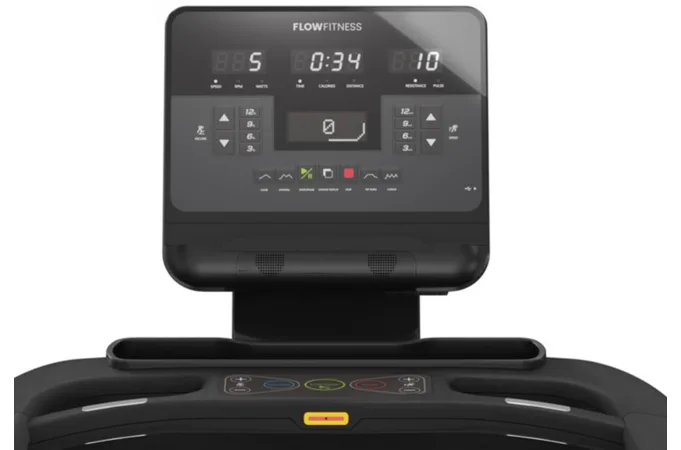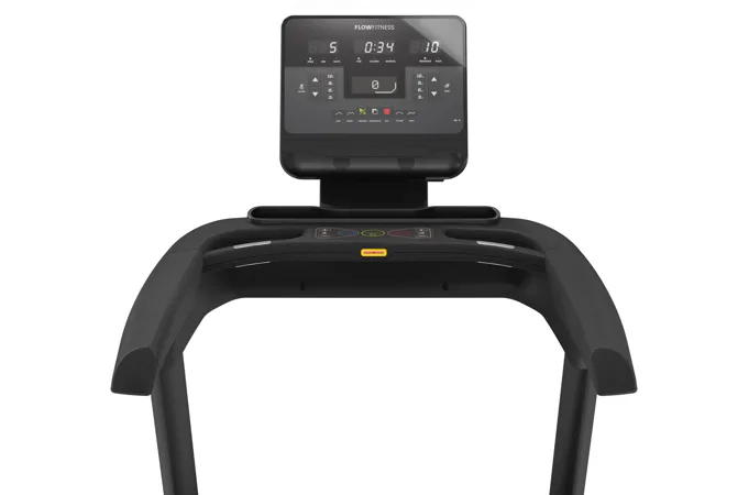 Běžecký pás Flow Fitness Perform Pro T6i LED disponuje snadno ovladatelným počítačem, dvěma držáky na lahev, senzory pro měření tepové frekvence a transportními kolečky.