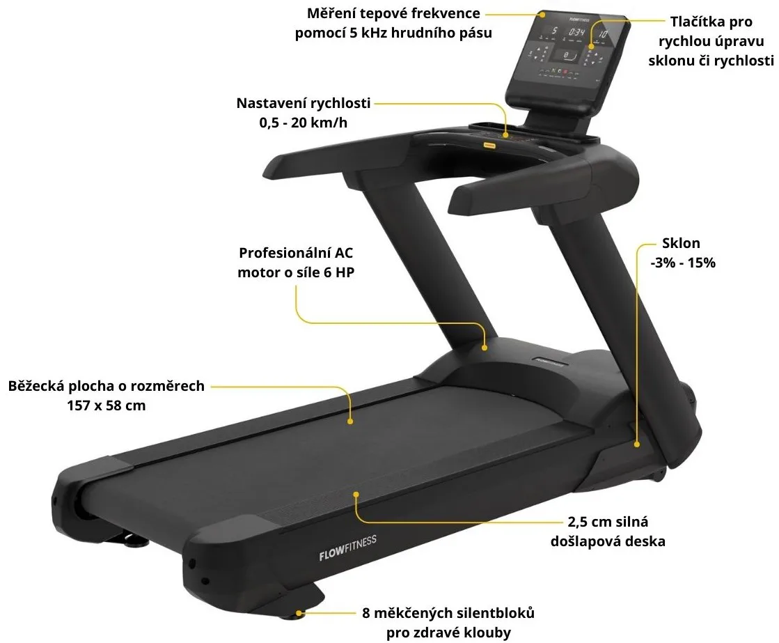 Flow Fitness Perform Pro T6i LED patří k vrcholovým běžeckým pásům, které si můžete nejen v komerčních, ale i domácích podmínkách přát a jistě uspokojí každého začínajícího i náročné běžce. Robustní ocelová konstrukce a výkonný střídavý AC motor zaručují dlouhou životnost stroje i při pravidelném několikahodinovém využívání. Lze ho využít nejen v domácím prostředí, ale i v prostředí plně komerčních posiloven, wellness, hotelových fitness centrech.