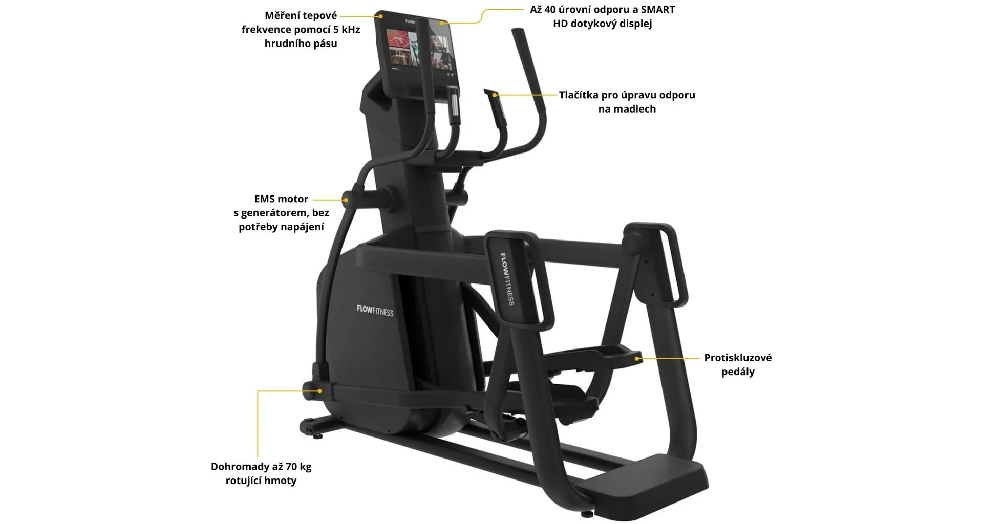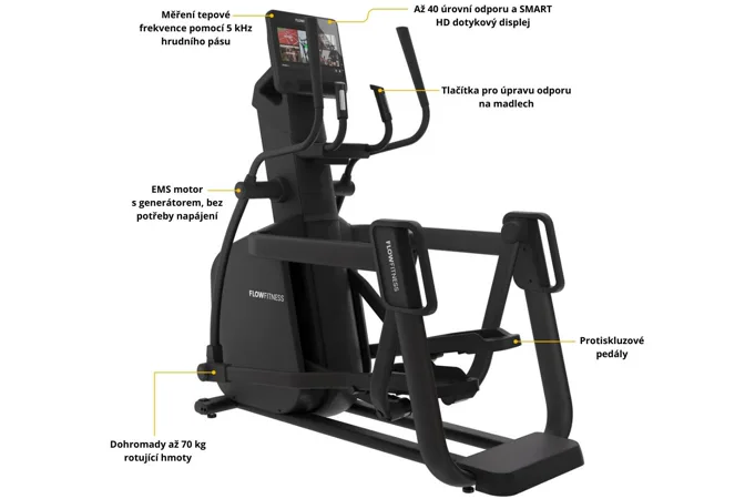 FLOW FITNESS X6i TFT je profesionální eliptický trenažér s grafickým HD dotykovým displejem. Ať už toužíte po aerobním tréninku s nízkou intenzitou nebo intervalový trénink s vysokou intenzitou, tento prémiový eliptický stroj to zvládne všechno. Uspokojí každého začínajícího i profesionálního cvičence.