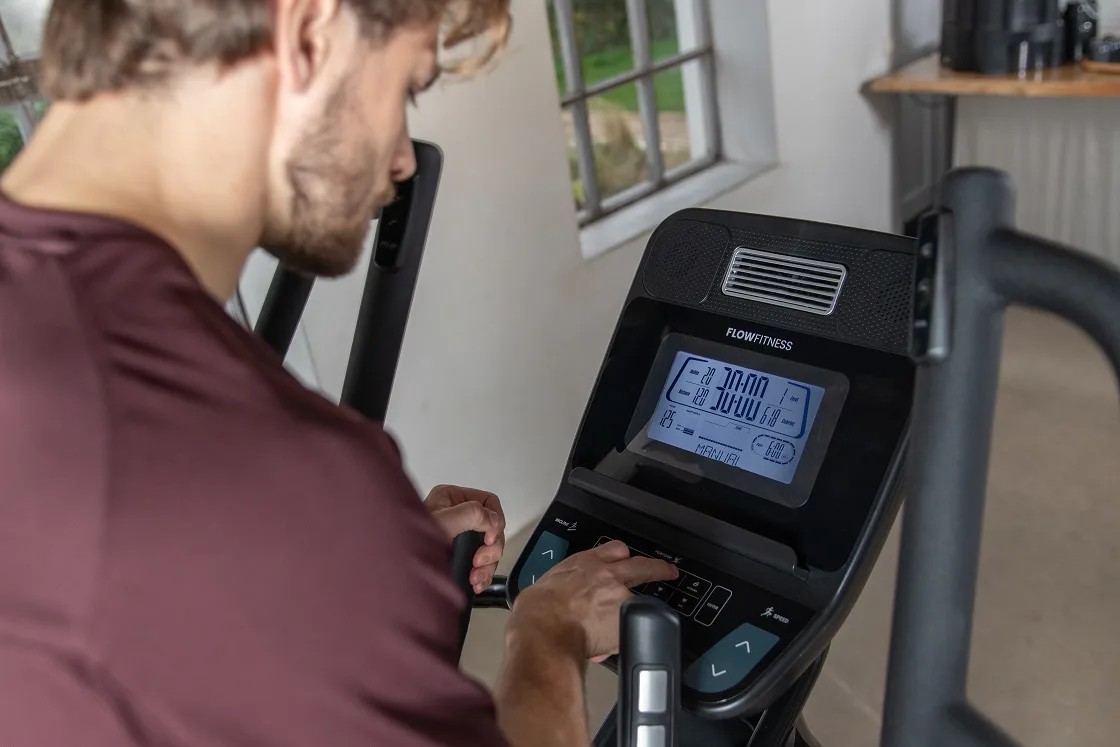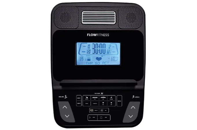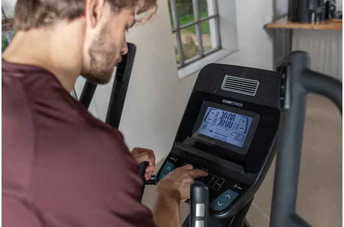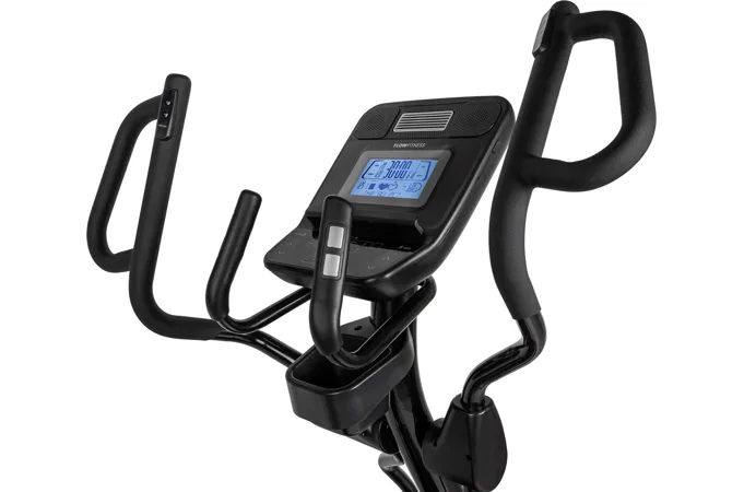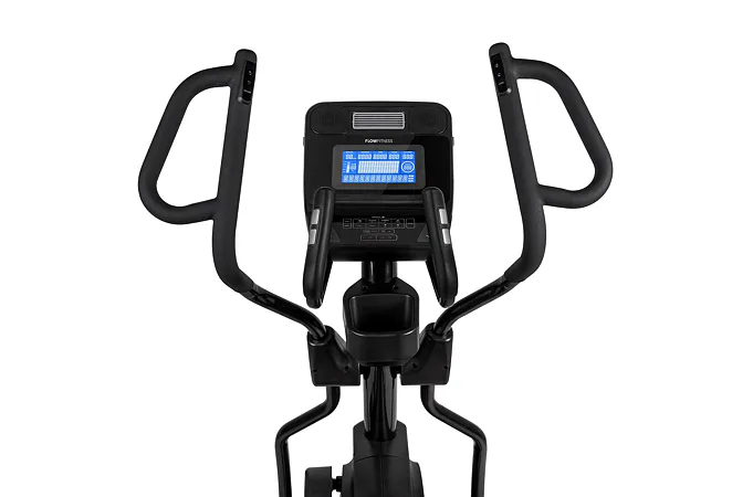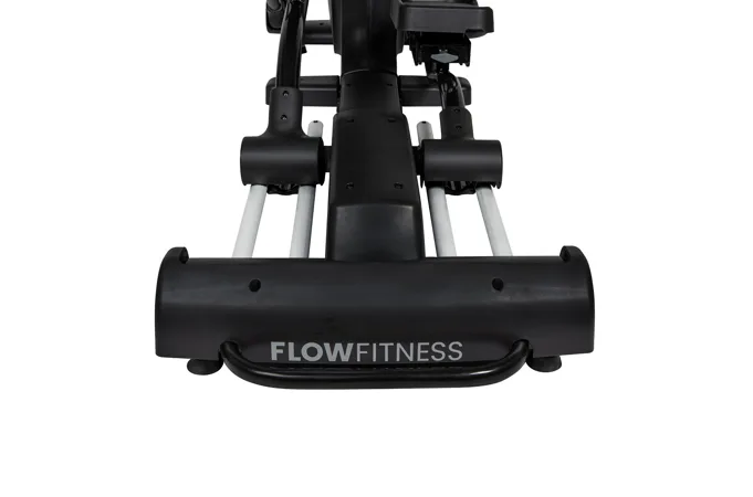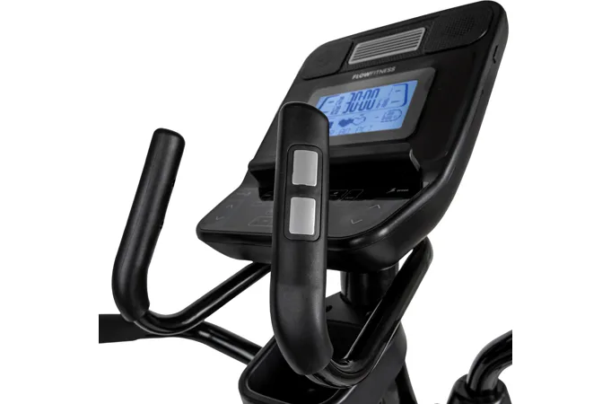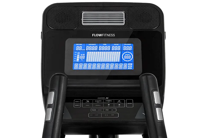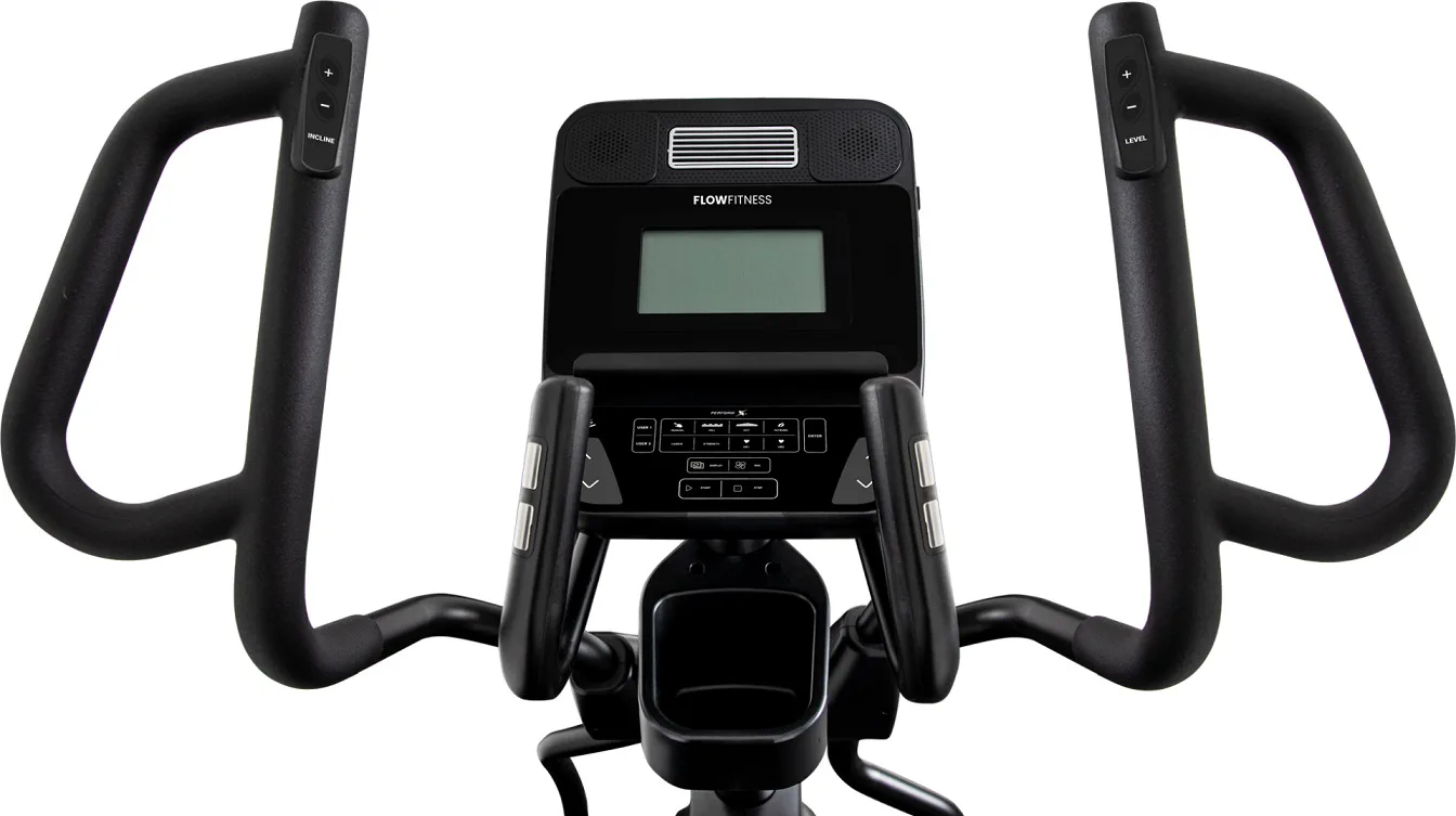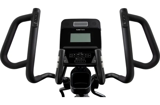 Eliptický trenažér Flow Fitness X5i je vybaven přehledným LCD displejem, držákem na tablet, senzory na měření tepové frekvence, transportními kolečky a vyrovnávači nerovnosti.