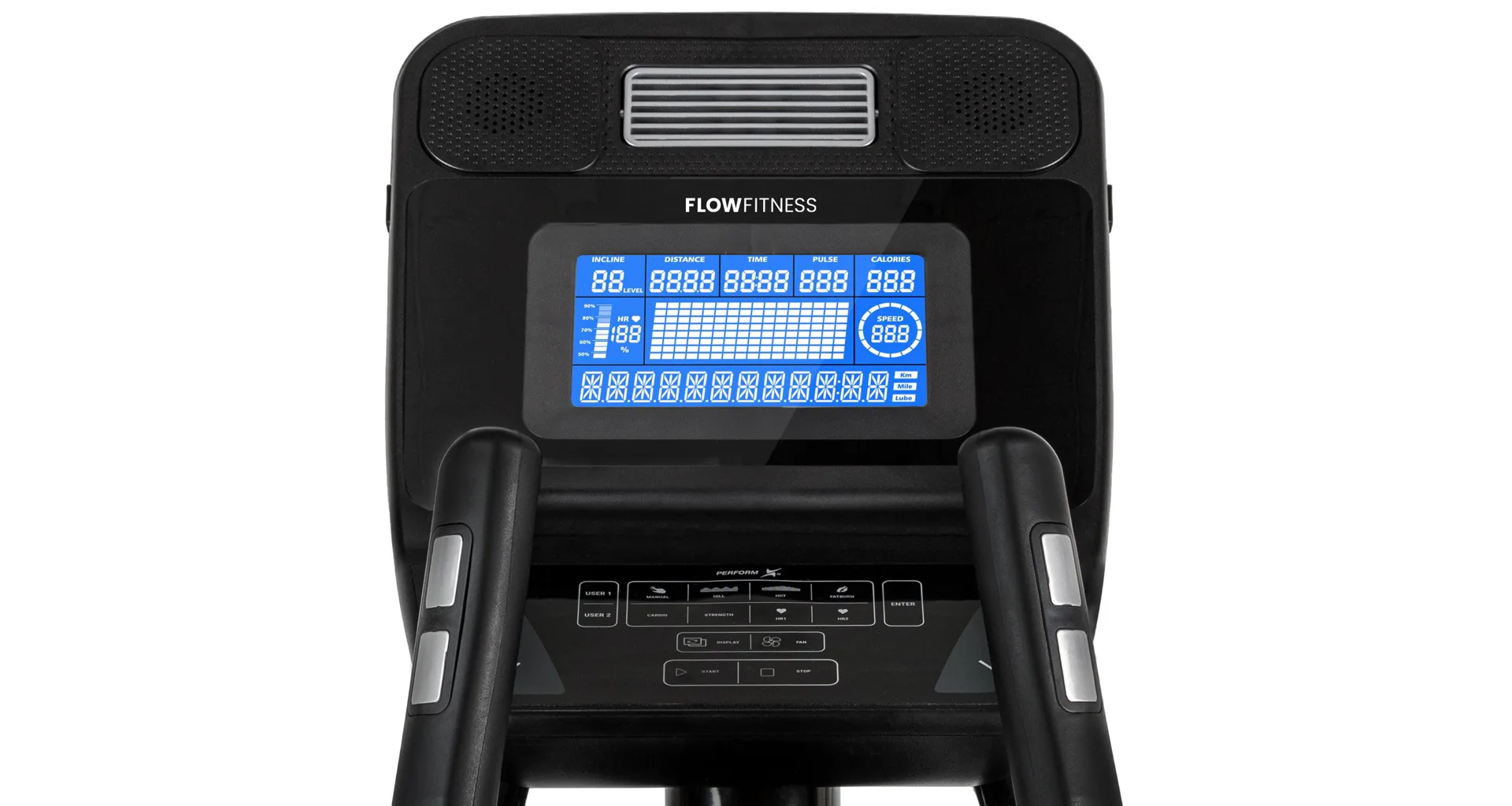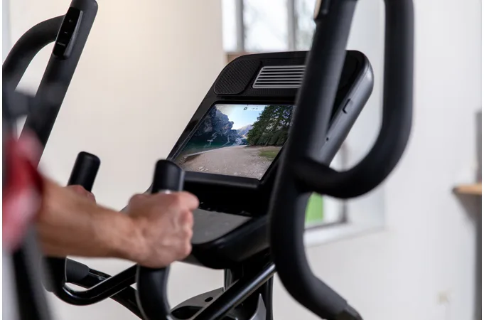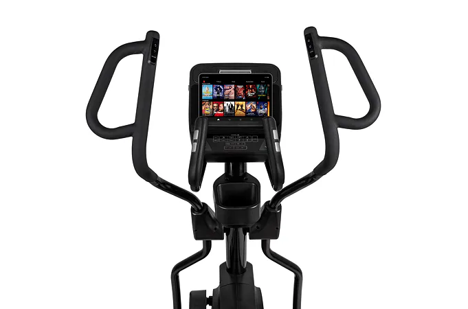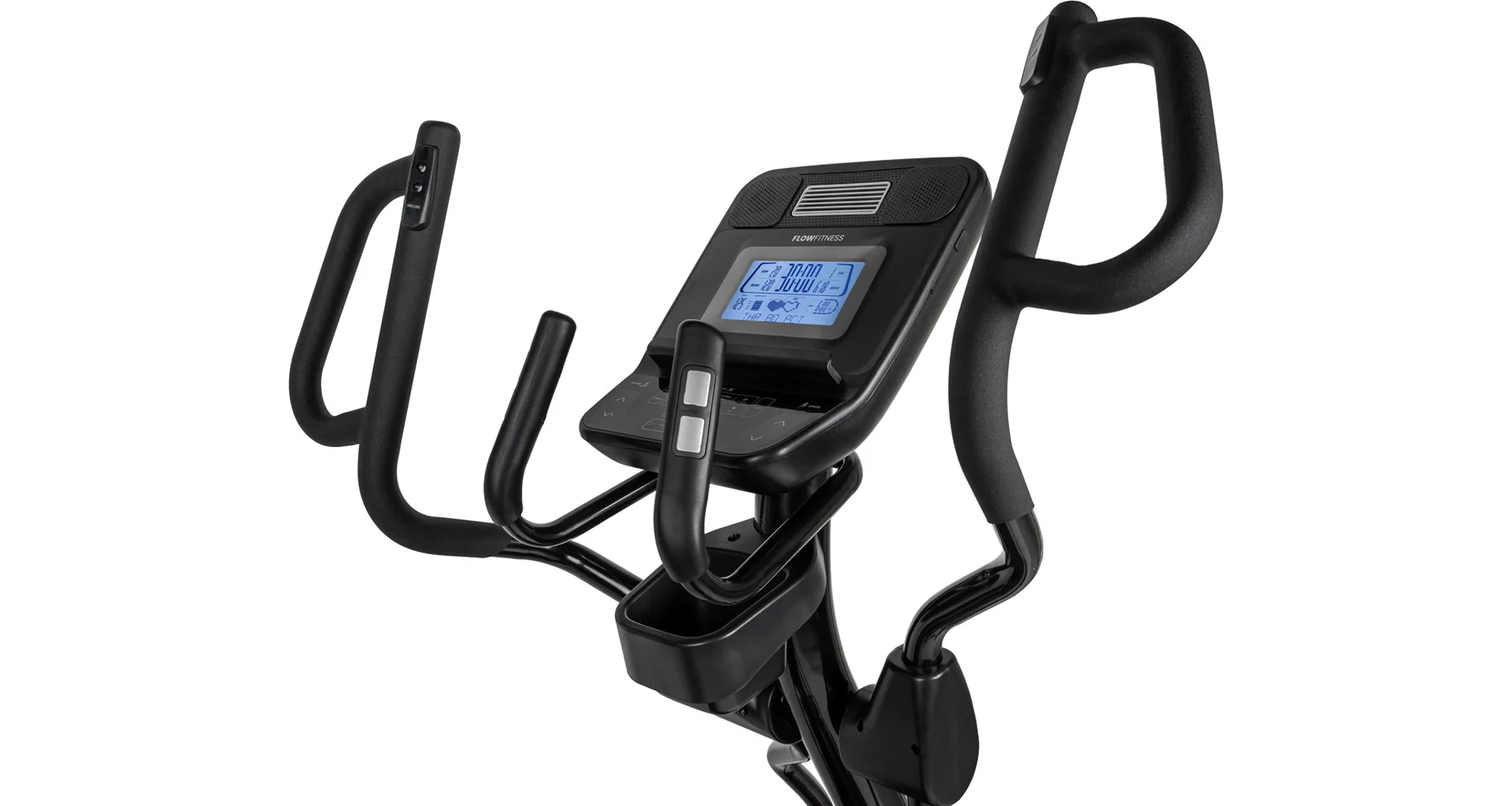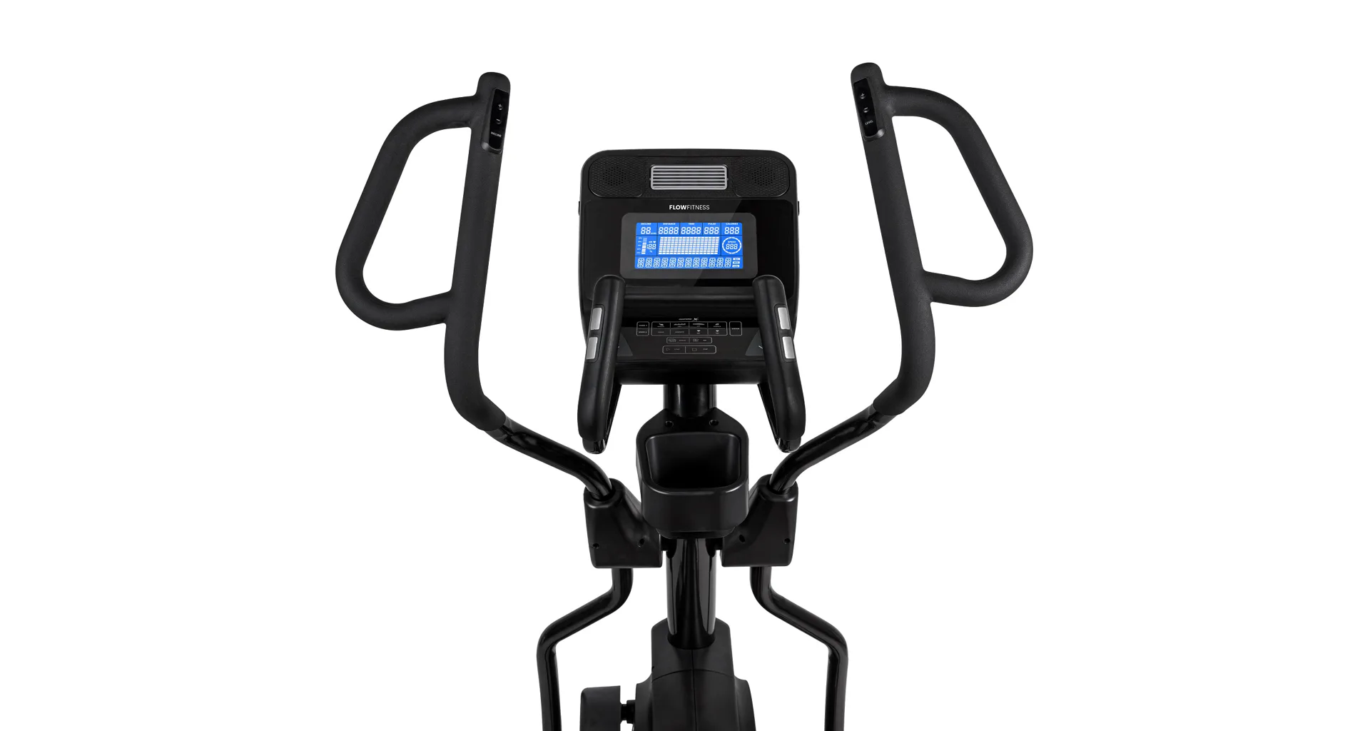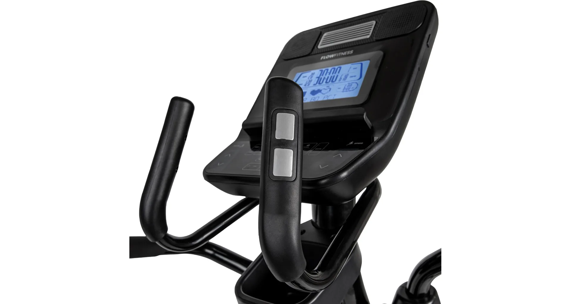 Eliptický trenažér Flow Fitness X5i je vybaven přehledným LCD displejem, držákem na tablet, senzory na měření tepové frekvence, transportními kolečky a vyrovnávači nerovnosti.