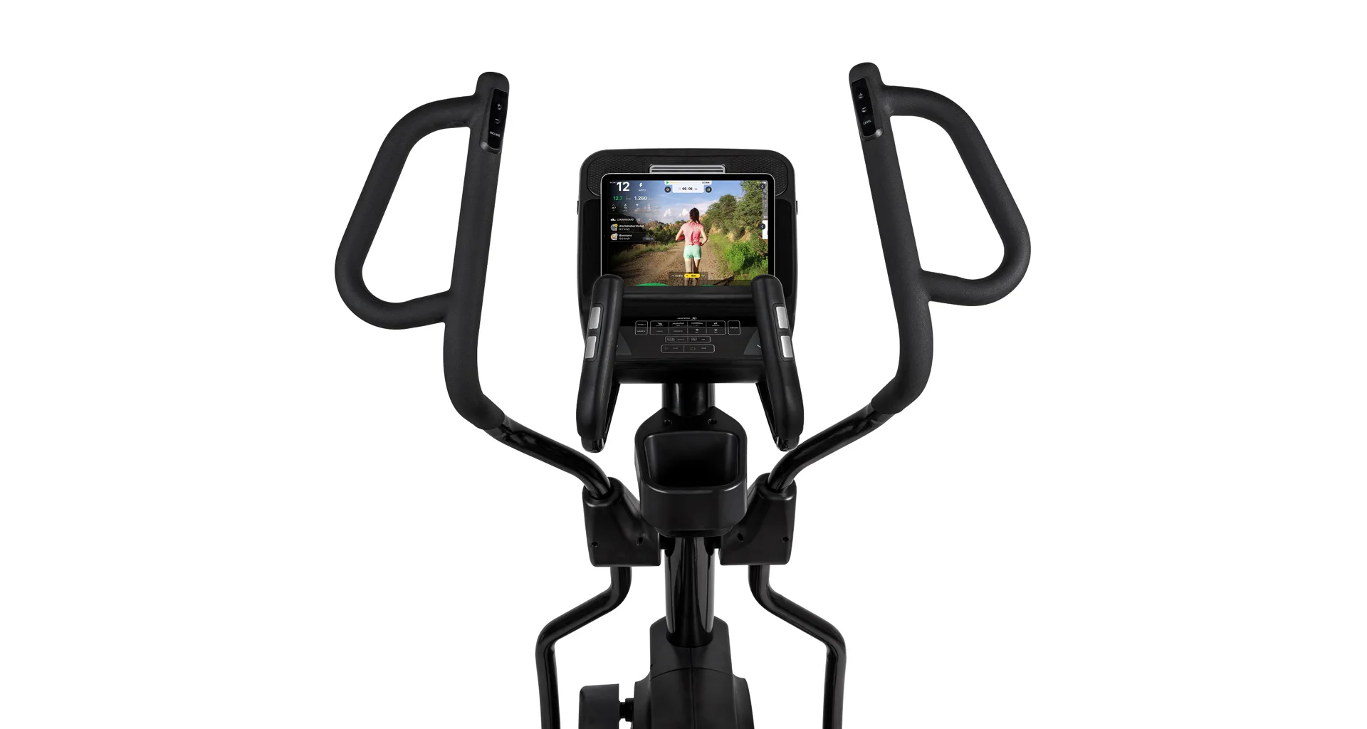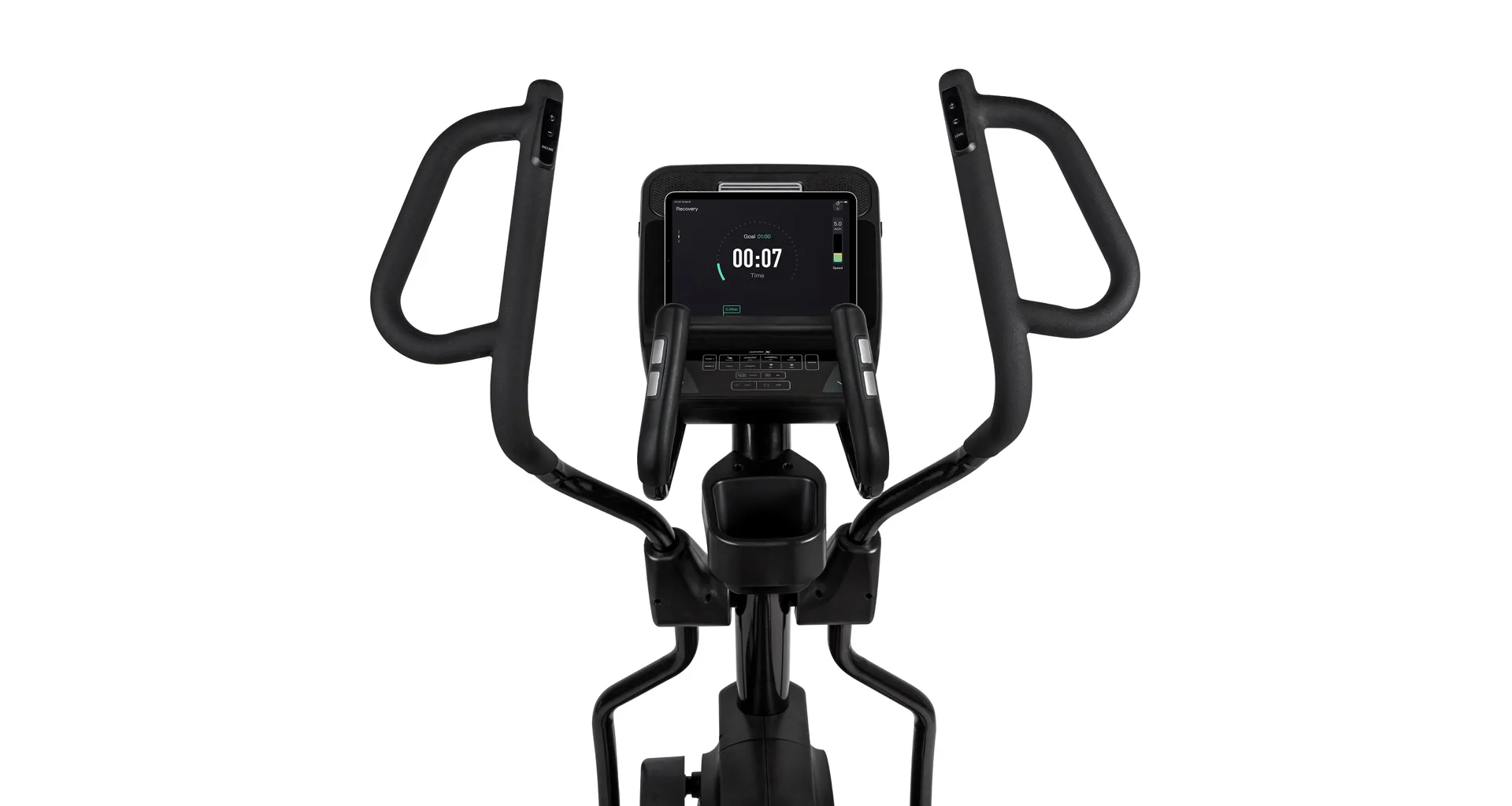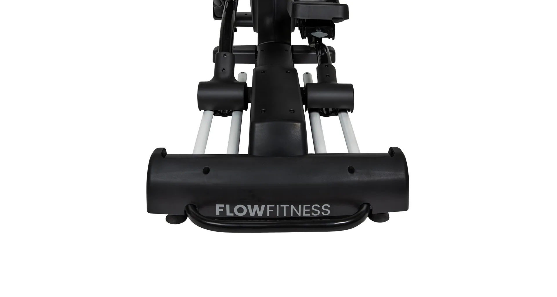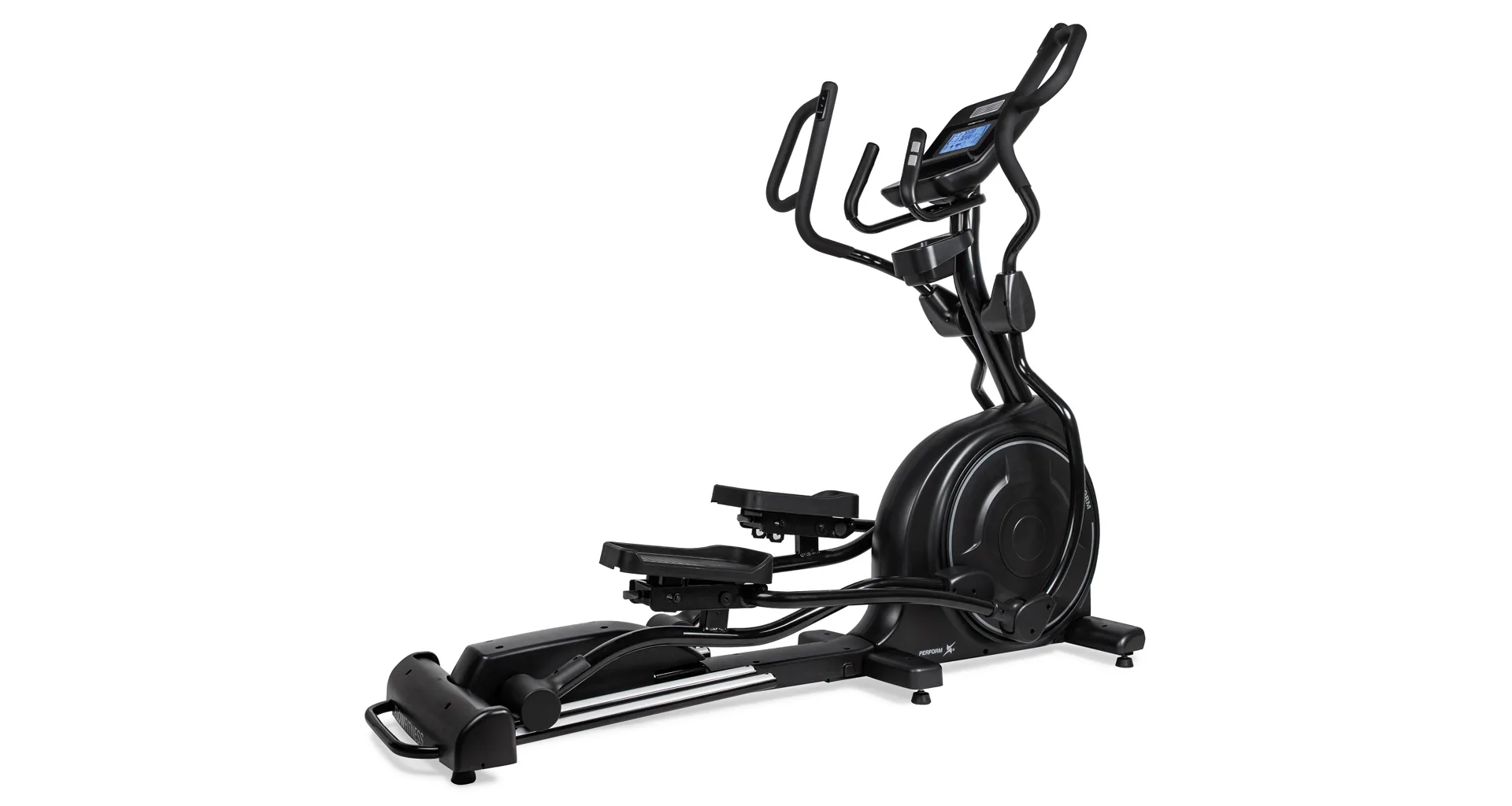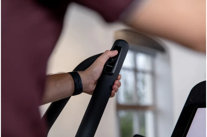 Eliptický trenažér Flow Fitness X5i je vybaven přehledným LCD displejem, držákem na tablet, senzory na měření tepové frekvence, transportními kolečky a vyrovnávači nerovnosti.