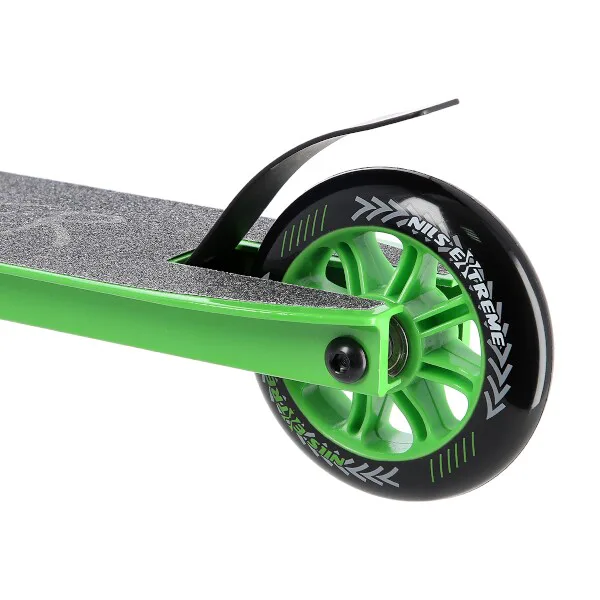 NILS Extreme HS102 je freestyle koloběžka s nosností 100 kg a je tak vhodná jak pro děti, tak pro dospělé. Konstrukce je vyrobena ze silné a trvanlivé oceli. Model HS104 je vhodný na asfalt a dlažbu. Kolečka o rozměru 100 x 24 mm jsou osazeny ložisky ABEC 7, bezpečnost zaručuje zadní přítlačná (blatník) brzda. NILS Extreme HS102 je díky malým, rychlým kolečkům, robustní, pevné konstrukci a řídítkům protáčejícím se o 360° určena k provádění triků.