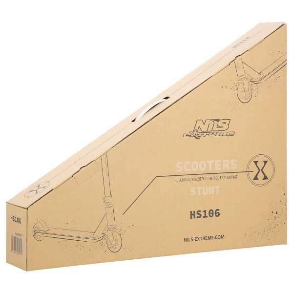NILS Extreme HS106 je freestyle koloběžka s nosností 100 kg a je tak vhodná jak pro děti, tak pro dospělé. Konstrukce je vyrobena ze silné a trvanlivé oceli, platforma je z hliníku. Model HS106 je vhodný na asfalt a dlažbu. Kolečka o rozměru 100 x 24 mm jsou osazeny ložisky ABEC 7, bezpečnost zaručuje zadní přítlačná (blatník) brzda - takzvaný Flexi fender. NILS Extreme HS106 je díky malým, rychlým kolečkům, robustní, pevné kostrukci a řídítkům protáčejícím se o 360° určena k provádění triků.