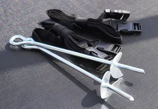 Součástí balení je rovněž kotvící sada, která obsahuje kolíky a textilní popruhy. Slouží pro zajištění trampolíny k zemi při nepříznivém počasí. Sada obsahuje 4 kusy kotvicích kolíků.