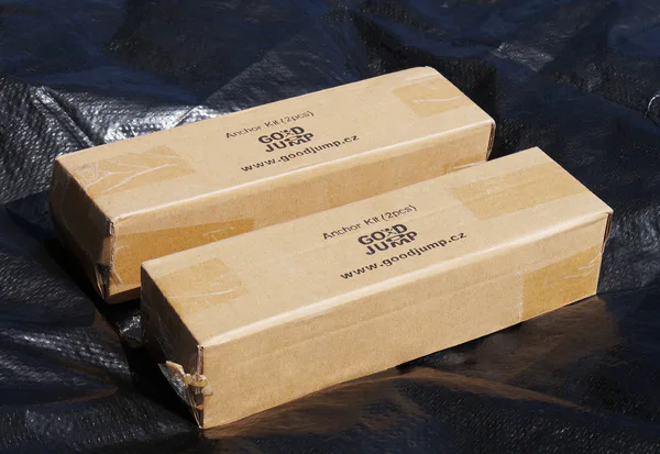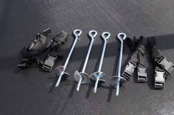 Součástí balení je rovněž kotvící sada, která obsahuje kolíky a textilní popruhy. Slouží pro zajištění trampolíny k zemi při nepříznivém počasí. Sada obsahuje 4 kusy kotvicích kolíků.