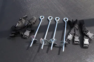 Součástí balení je rovněž kotvící sada, která obsahuje kolíky a textilní popruhy. Slouží pro zajištění trampolíny k zemi při nepříznivém počasí. Sada obsahuje 4 kusy kotvicích kolíků.