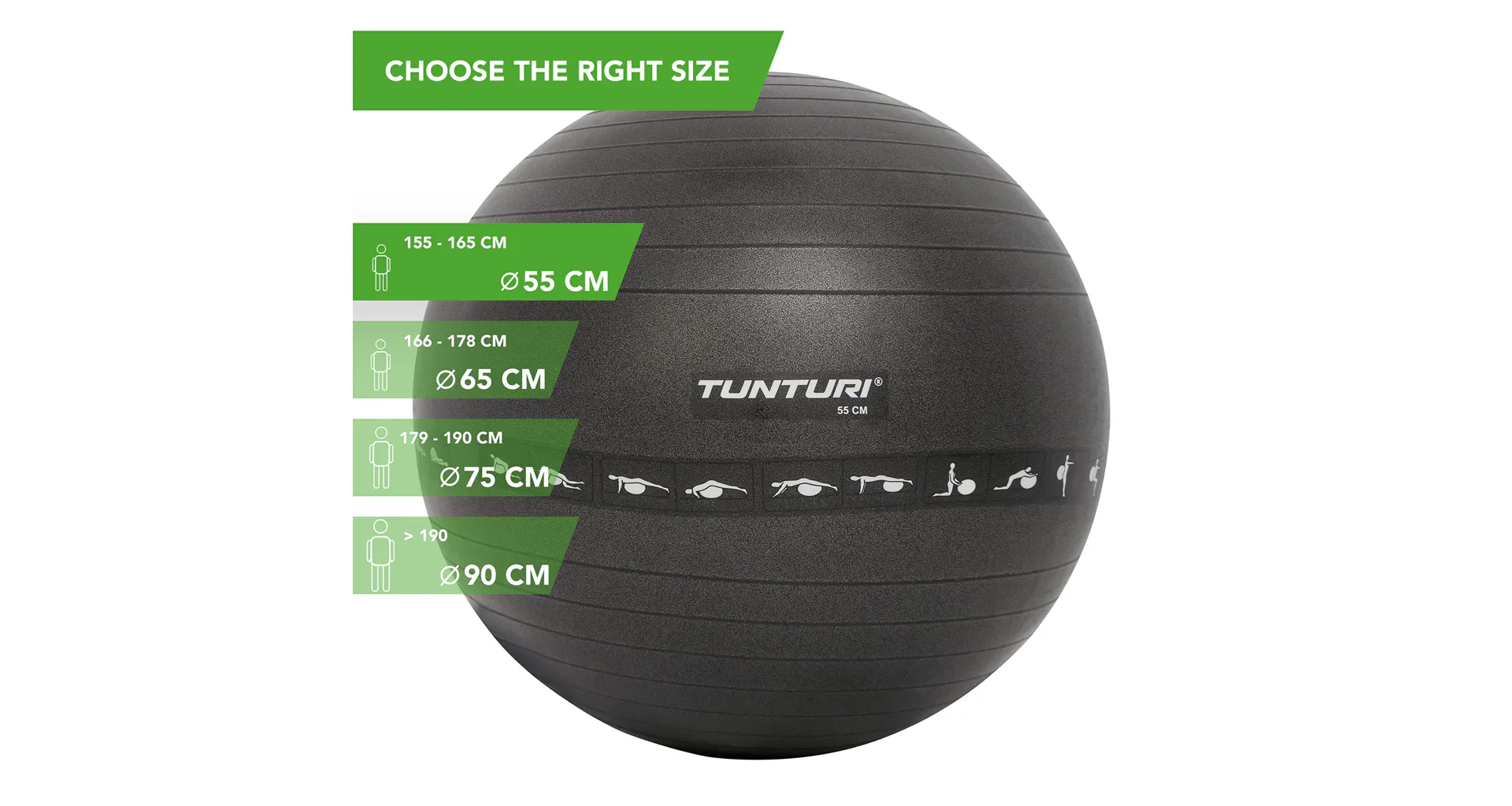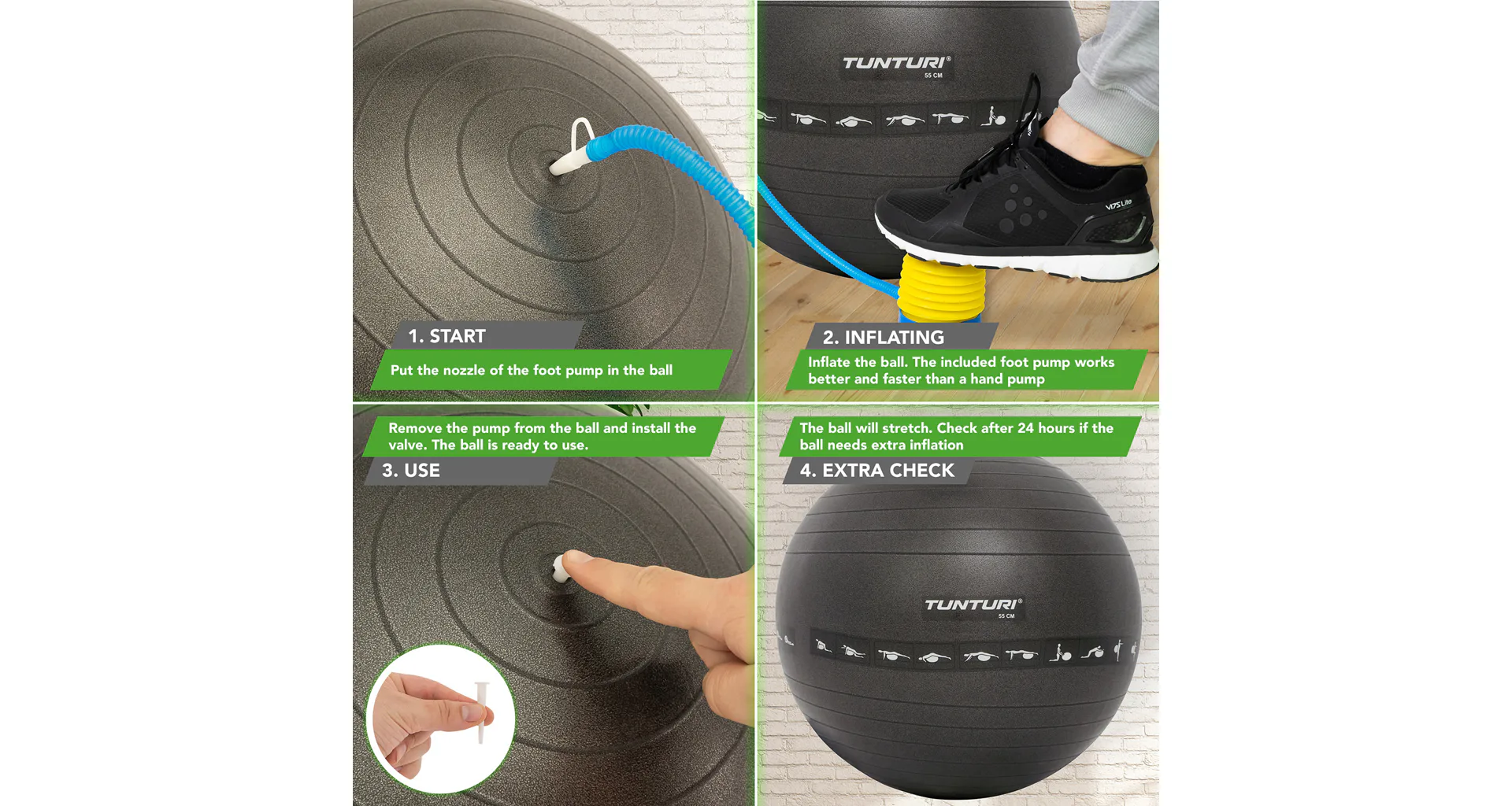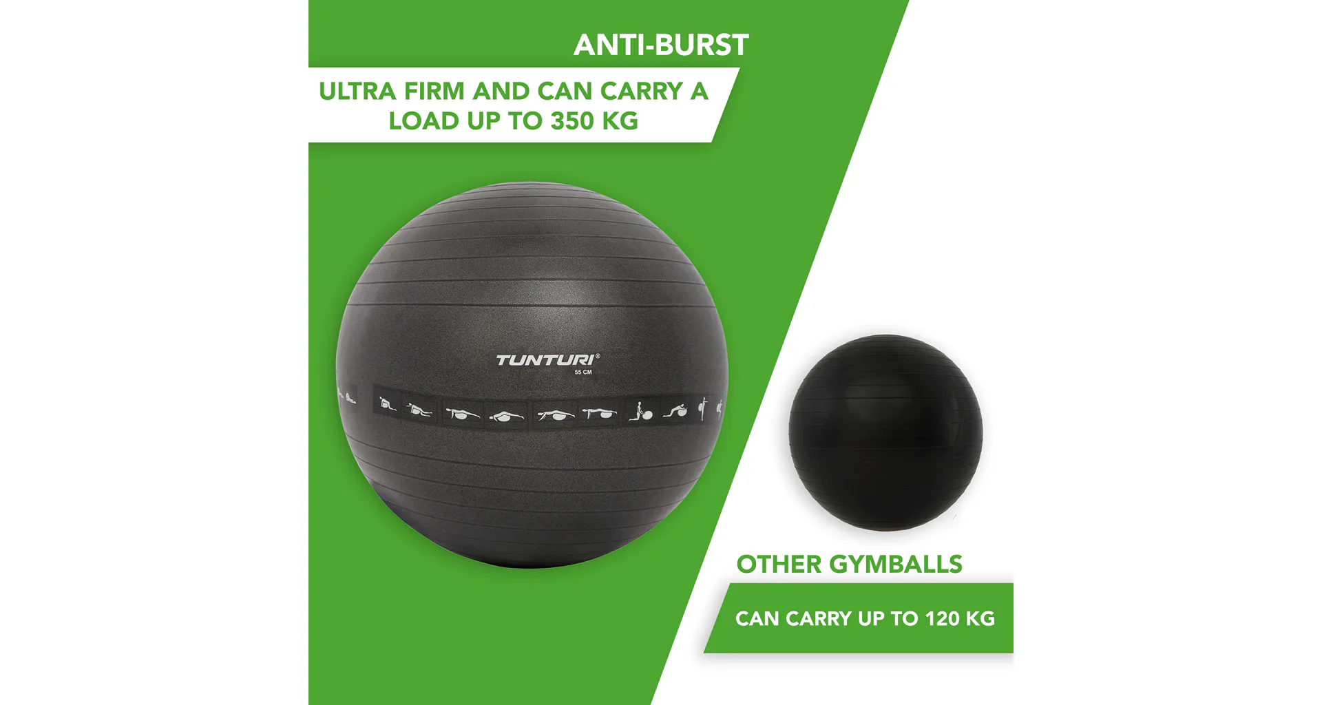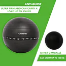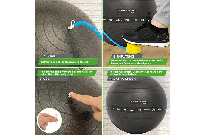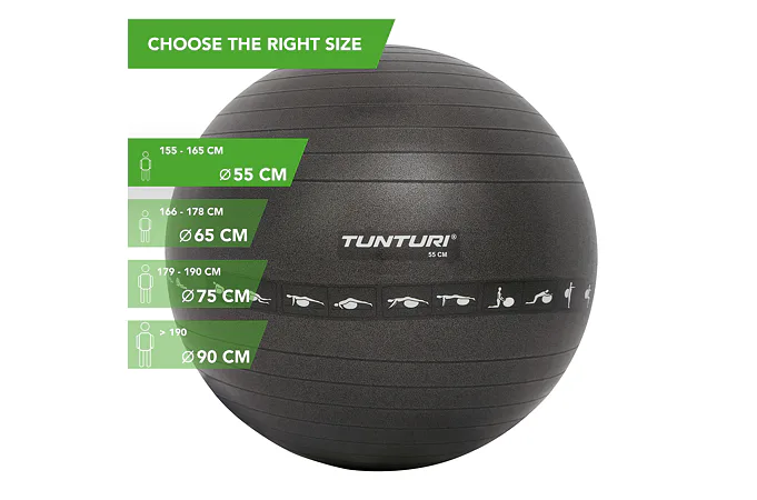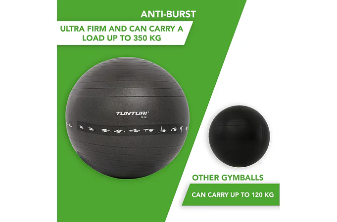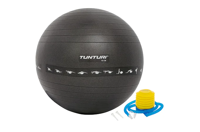 Gymnastické míče od značky TUNTURI jsou z velmi odolného materiálu a s kvalitní povrchovou úpravou. Slouží jako výborná pomůcka pro komerční i domácí využití. Díky povrchu ANTI-BURST míč při náhodném propíchnutí nepraskne, ale postupně z něho uchází vzduch. Velký cvičební gymnastický míč má nosnost do 300 kg. Balení obsahuje pumpičku pro nahuštění míče.