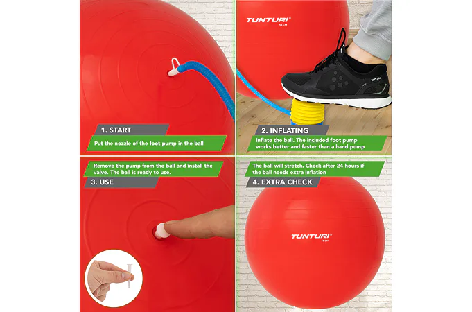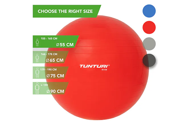 Série gymnastických míčů TUNTURI je vyráběna v několika velikostech a barvách. Součástí balení je vždy ruční pumpa k snadnému nafouknutí míče. Gymnastické míče TUNTURI se vyznačují vysokou nosností 300 kg, tvarovou stálostí, kvalitním a příjemným materiálem.