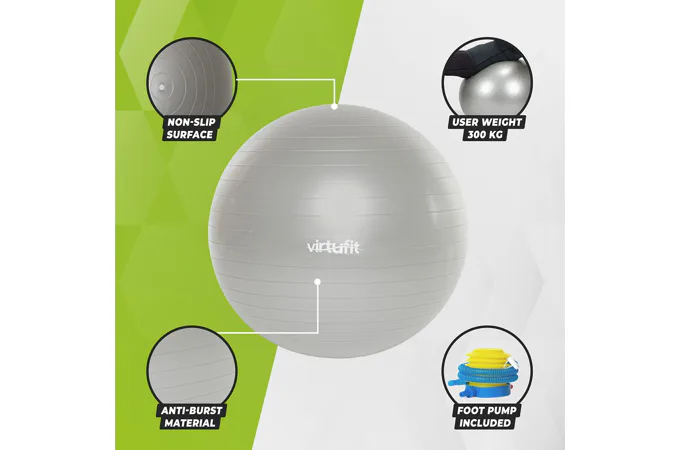 Gymnastické míče VirtuFit se vyrábí v různých velikostech. Součástí balení je vždy ruční pumpa k snadnému nafouknutí míče. Gymnastické míče se vyznačují vysokou nosností 300 kg, tvarovou stálostí, kvalitním a příjemným materiálem.