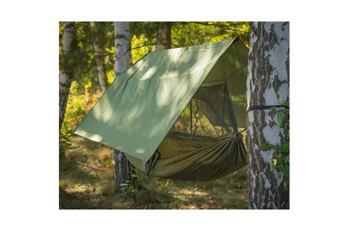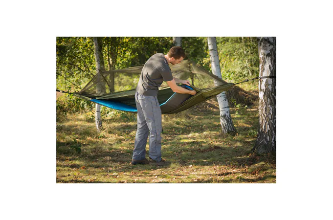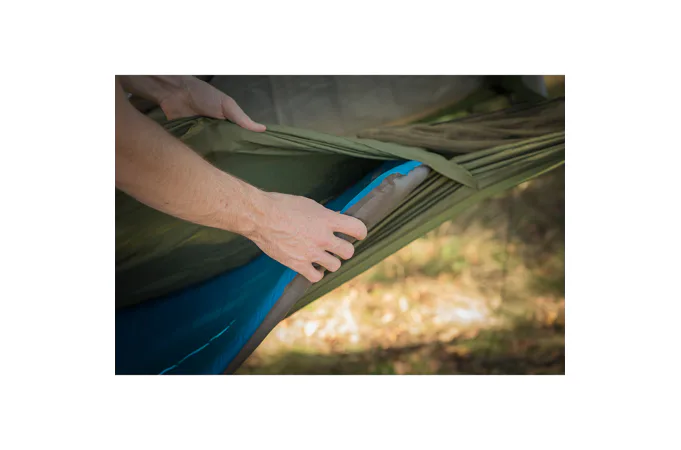 Hamaka má dvojité dno, které vytváří kapsu na karimatku. Karimatka je díky tomu uzavřena na jednom místě a neposouvá se, když zalézáte do spacáku a uléháte do hamaky.