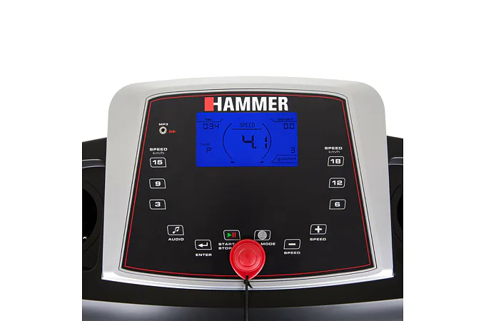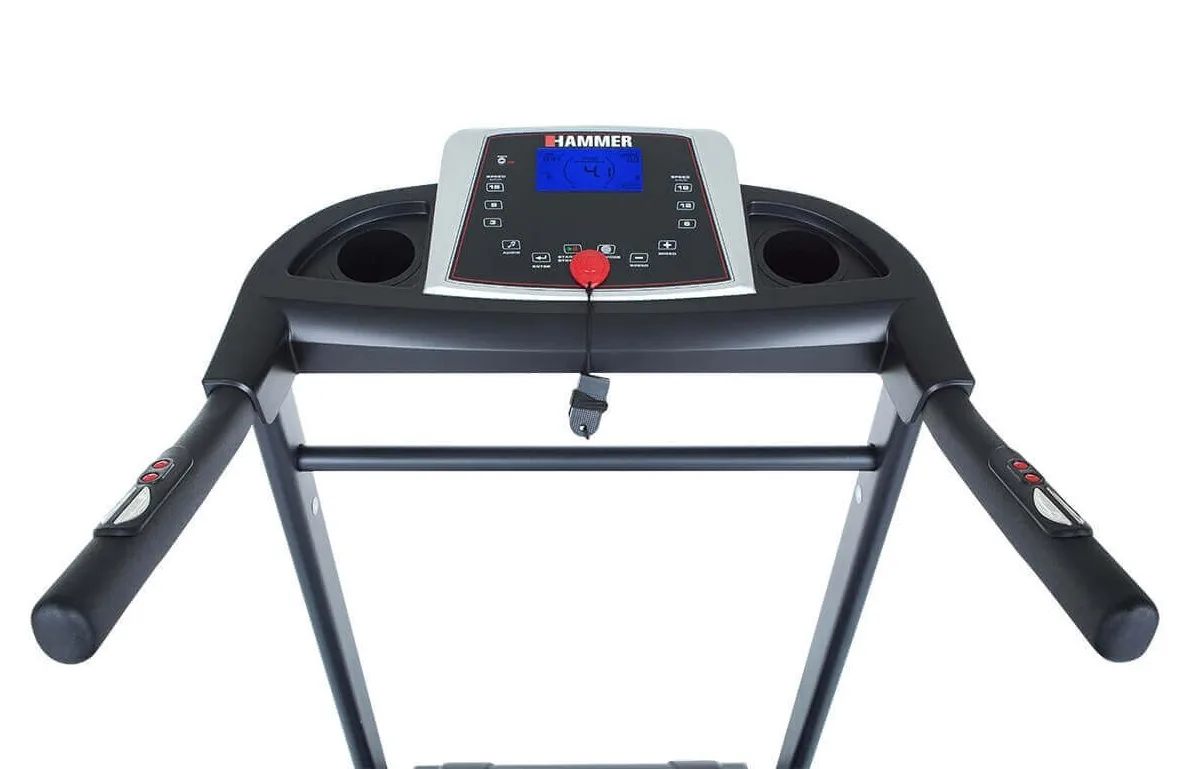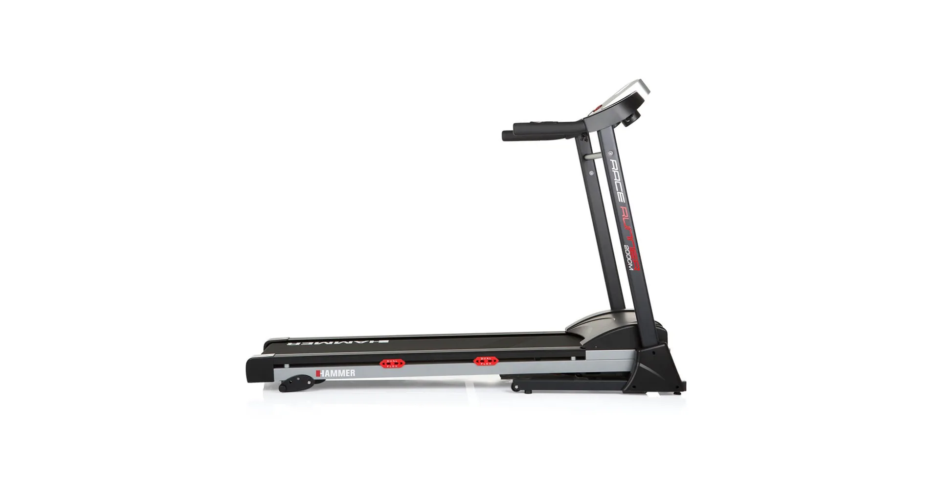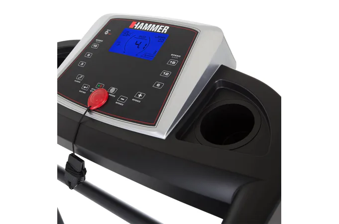 HAMMER Race Runner 2000m je vybaven přehledným počítačem, držákem na lahev, transportními kolečky, integrovanými snímači pro měření tepové frekvence, stop pojistkou a MP3 vstupem.