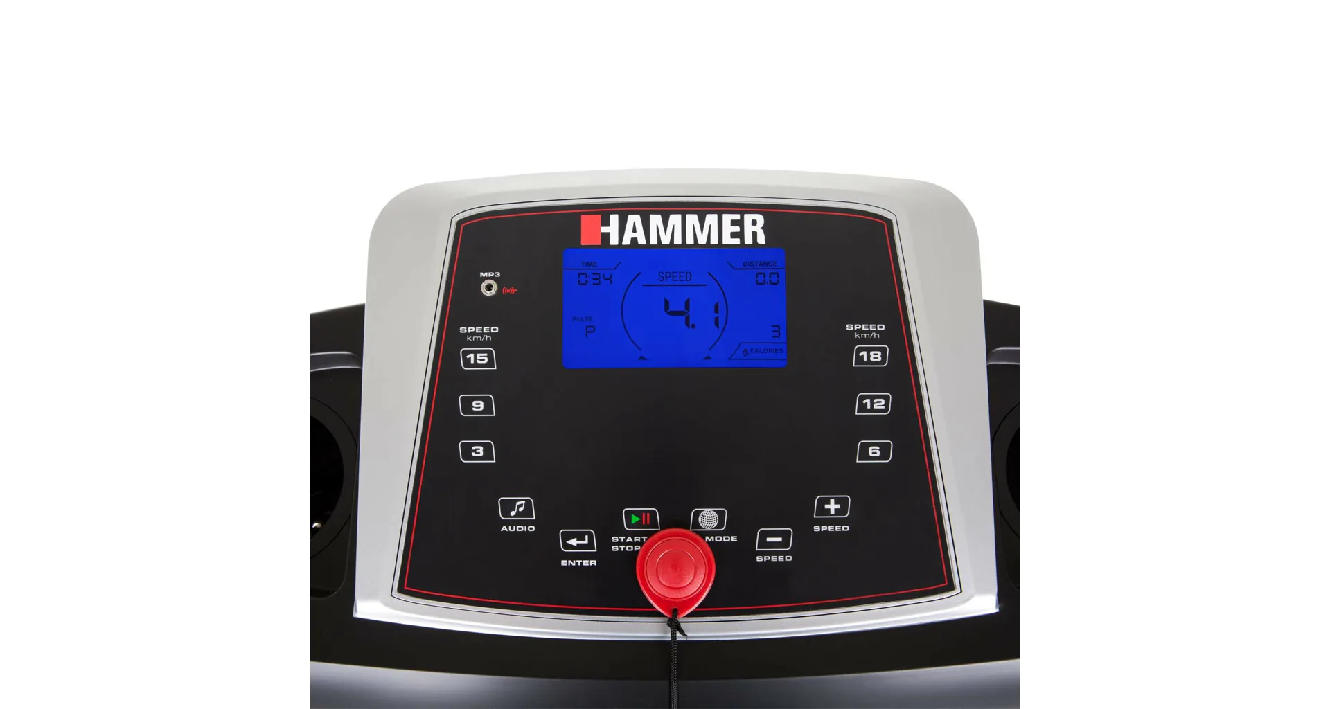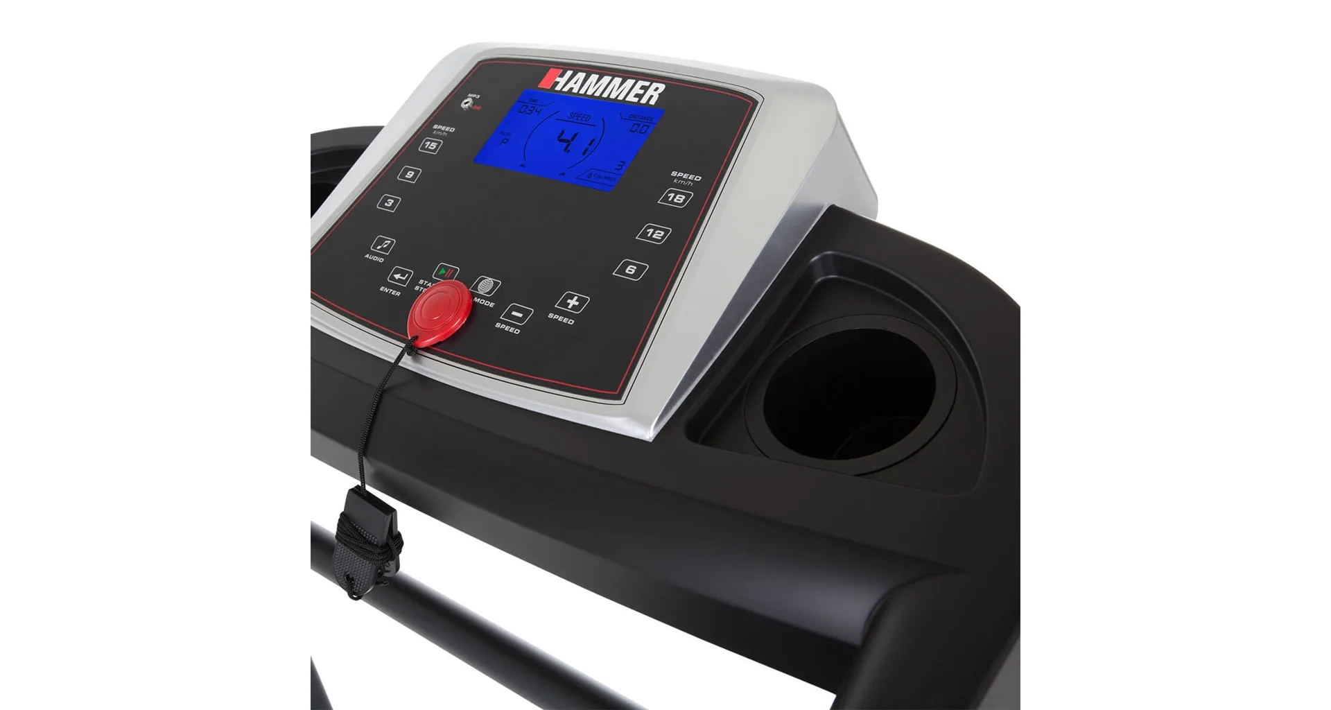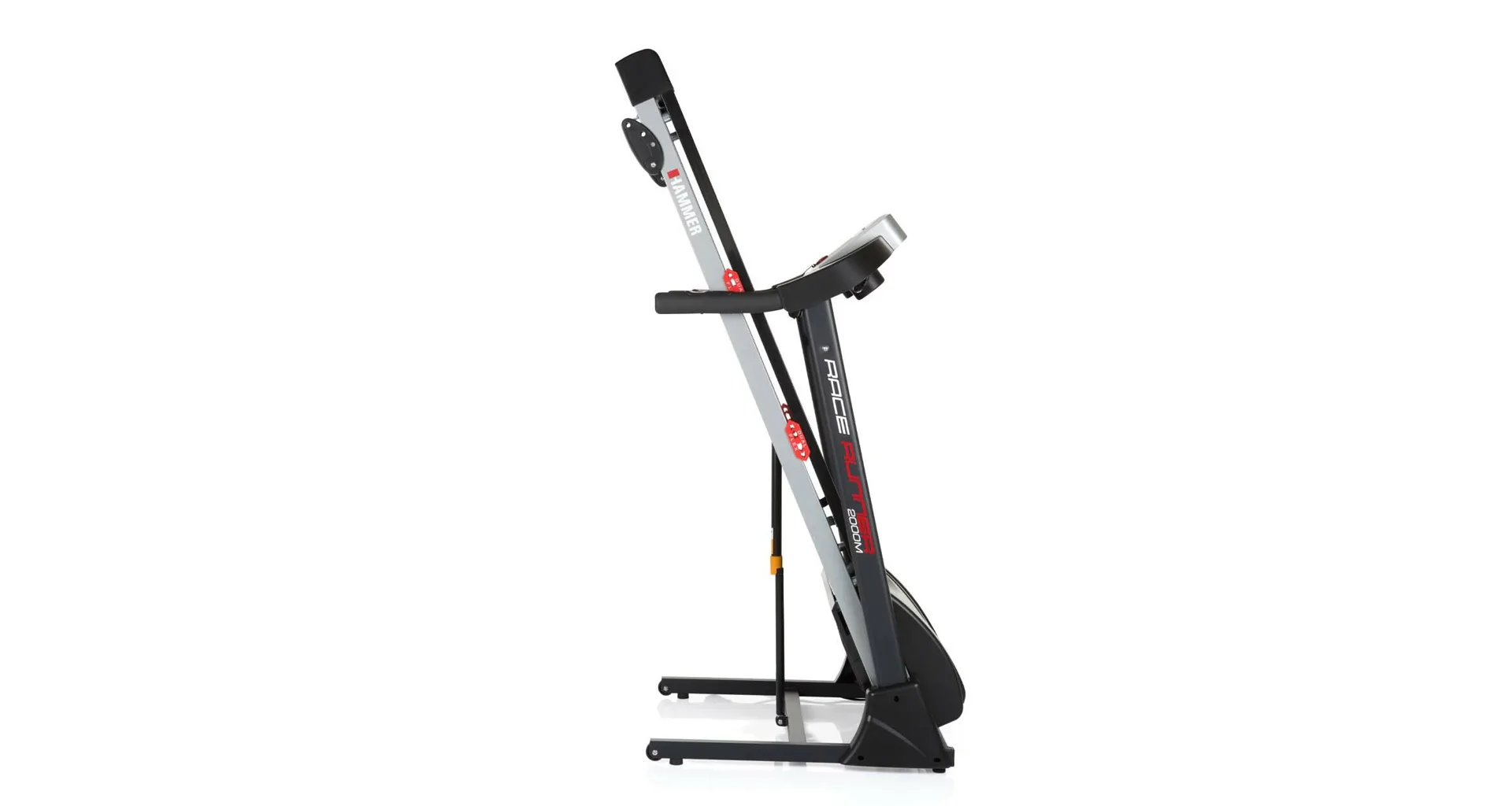 HAMMER Race Runner 2000m je vybaven přehledným počítačem, držákem na lahev, transportními kolečky, integrovanými snímači pro měření tepové frekvence, stop pojistkou a MP3 vstupem.