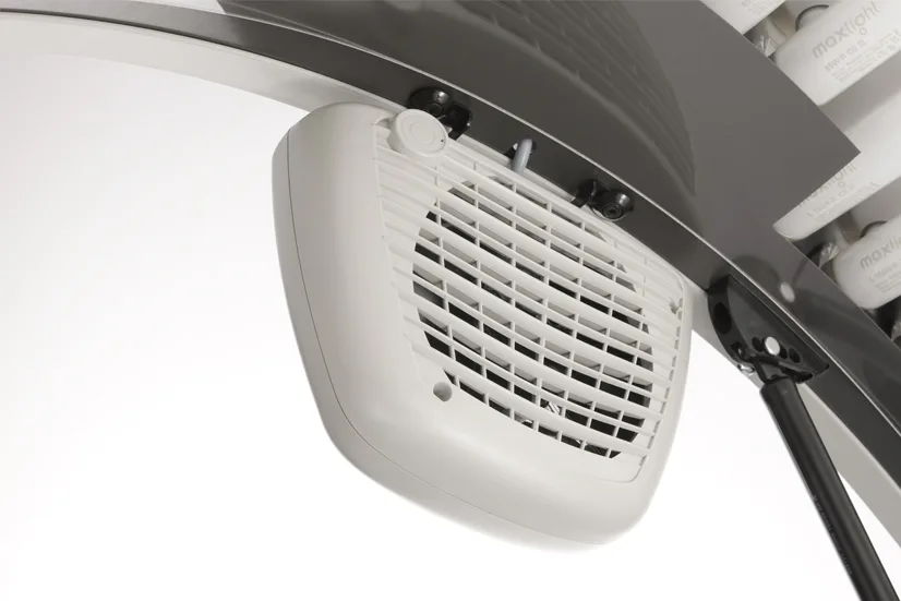 HAPRO Proline 28/1 C Lounge Red disponuje až 24 opalovacími lampami o výkonu 100 W a 4 opalovacími lampami o výkonu 80 W. Tento model je také vybaven 400 W vysokotlakým opalovacím zařízením na obličej. Tato vysokotlaká lampa poskytuje optimální opálení obličeje a také poskytuje pohodlné infračervené teplo. Pomocí analogového ovládacího panelu si můžete snadno nastavit délku opalování. Pro pohodlnější manipulaci je ovládací panel možno používat i uvnitř solária. Solárium je navíc vybaveno chladícím ventilátor pro svěží pocit při opalování. (Chladící ventilátor lze zapnout a vypnout přímo uvnitř solária)