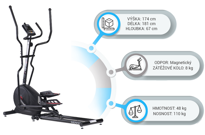 Eliptický trenažér HMS H6504 patří mezi univerzální zařízení určených do domácího prostředí pro celkové zlepšení zdraví, snížení tělesného tuku a zlepšení účinnosti organismu. Model H6504 je vybaven 8-mi kilogramovým setrvačníkem a manuálně ovládanou, magnetickou brzdou.