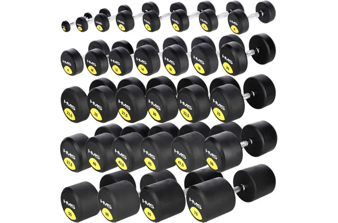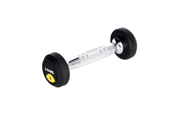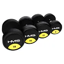 Jednoruční činky HMS HG Pro s hmotností od 1-70 kg jsou určeny pro profesionální použití jak doma tak v posilovně. Závaží tvoří litinový odlitek pokrytý silnou vrstvou gumy, která ochrání jak činku, tak podklad před poškozením. Na čelní straně je značka HMS a údaj o hmotnosti v kilogramech. Rukojeť je vyrobena z chromované oceli. Pro pohodlný úchop má soudkovitý tvar s vroubkováním.