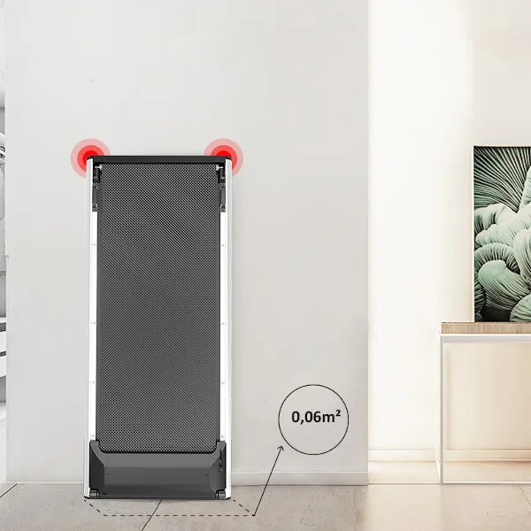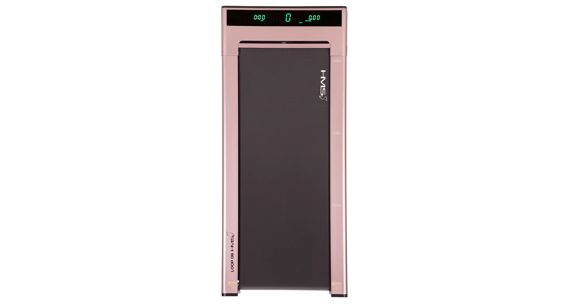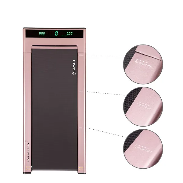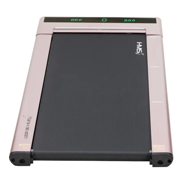 Běžecký trenažér HMS LOOP06 je technologií XXI. století, moderní, lehký a má intuitivní použití. S použitím designu moderních mobilních telefonů, byl trenažér navržen v nejvíce elegantní podobě, tj. tenké tělo s vestavěným digitálním displejem - bez horního rámečku, velikého displeje a podpěradel. Po vertikálním umístění zabírá trenažér pouze 0,06 m2 povrchu. HMS LOOP06 je velmi lehký a praktický, což umožňuje neomezené přenášení a uskladnění kdekoli. Má intuitivní systém spouštění tréninku a moderní systém řízení rychlosti. Stačí vyjít na pás trenažéru, abychom toto neuvěřitelné zařízení spustili. Když se přiblížíme k displeji, rychlost se zvýší, ale pokud budeme blíže zadní části trenažéru, pak se rychlost sníží. Displej informuje o vzdálenosti, době tréninku a počtu kroků. Model je velmi tichý, hladina hluku je pouhých 65 dB. V běžeckém trenažéru byl použit inovativní systém spojů pomocí šroubů. Další předností je systém absorbující otřesy během běhu.HMS LOOP06 je nejmenší a zároveň nejinstinktivnější běžecký trenažér na trhu.