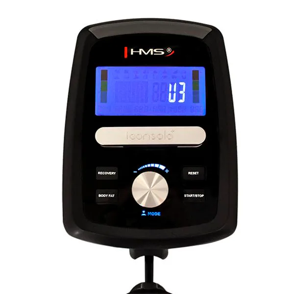 Magnetický ergometr HMS M 0410 disponuje moderním počítačem a dotykovými snímači sloužícími k měření pulsu. Jednoduchá mechanika stroje s miskovým šlapacím středem najde využití hlavně u začátečníků. Ergometr je opatřen elektronickou regulací zátěže v 12 stupňích. Výhodou je také, jeho v obou směrech stavitelné ergonomické sedlo, pro ideální nastavení výšky cvičence.