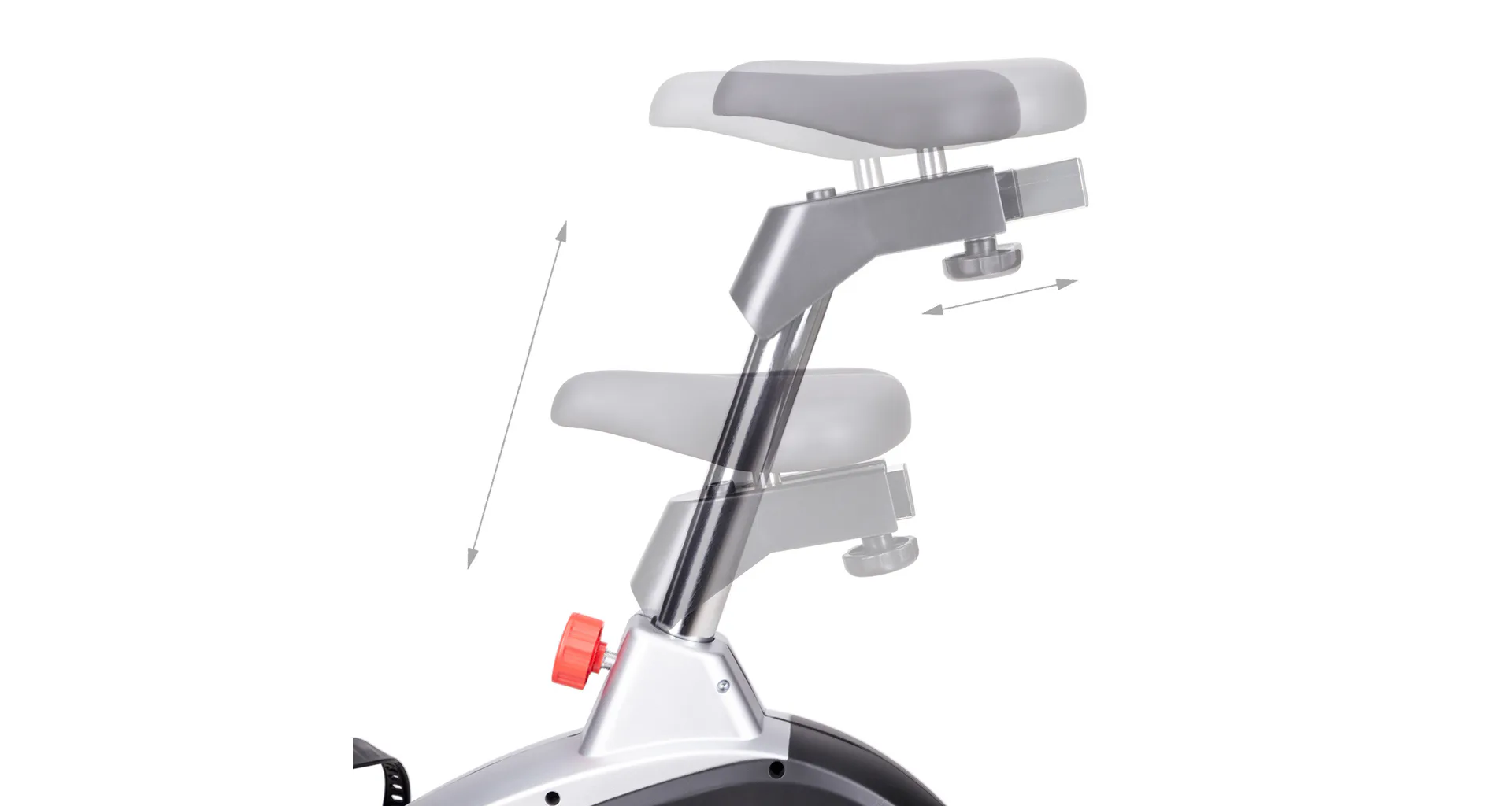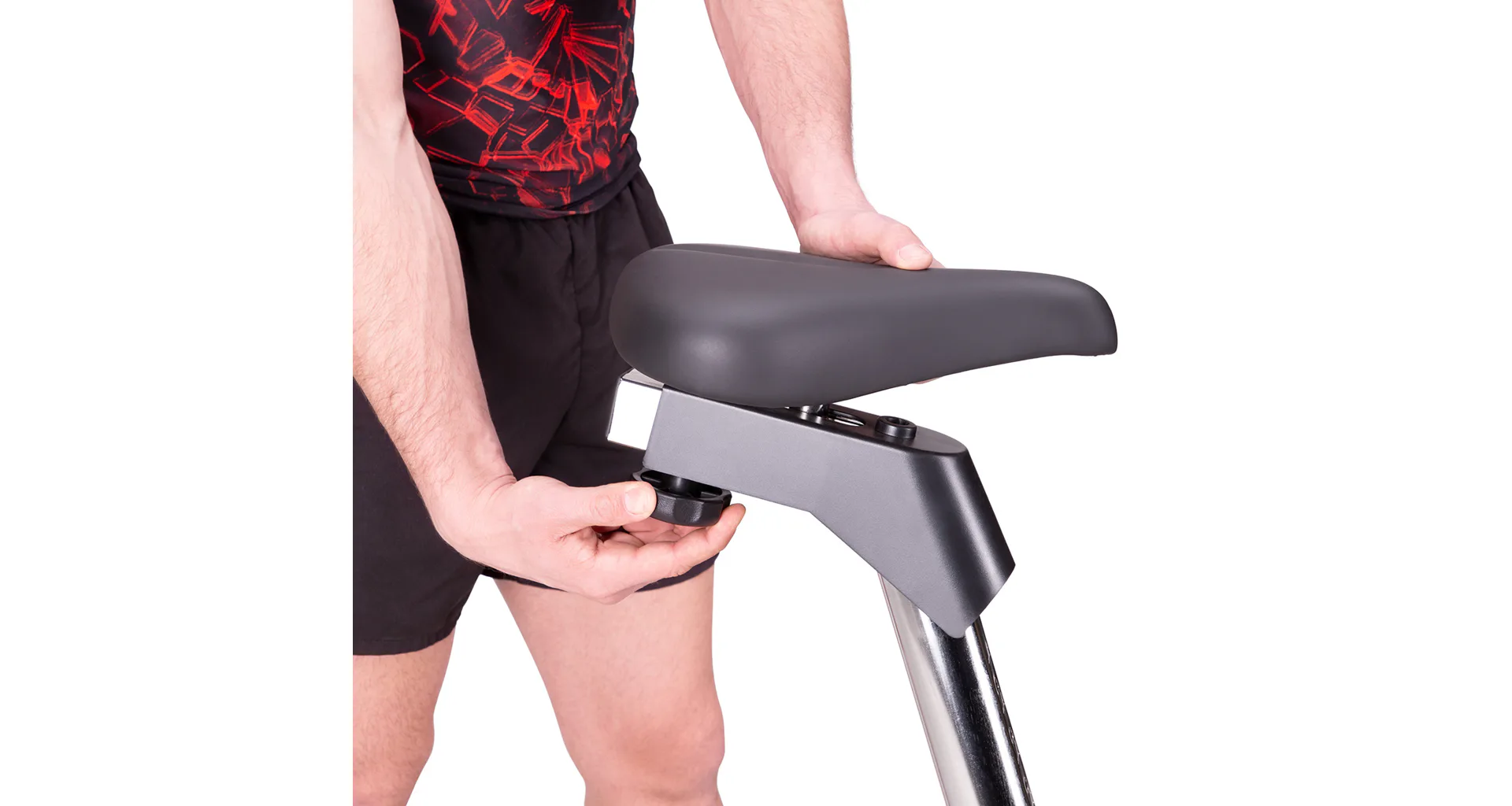 Řídítka s elektrodami pro snímání srdečního tepu, je možné naklápět. Sedlo je polohovatelné vertikálně do 9-ti poloh a v horizontální rovině je umístěno na kolejnici pro plynulý posun. Vzdálenost středu sedla od pedálů tak jde nastavit v rozsahu 66 - 92 centimetrů. Přední stabilizátor je vybaven kolečky pro snadné přesouvání. Zadní stabilizátor zase nabízí výškově nastavitelné podložky pro vyrovnání trenažéru do roviny.