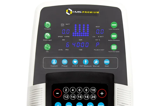 Počítač používá moderní LED displej, který zobrazuje průběh programu, rychlost, vzdálenost, počet otáček, spálené kalorie, výkon, tepovou frekvenci, čas tréninku a poměr tuku v těle. Klávesnice je vybavena všemi potřebnými tlačítky pro kompletní správu tréninku: Nalevo od displeje nalezneme 3 programy, které nastavují zátěž podle věku - dorostenec, dospělý, senior. Napravo od displeje jsou tlačítka pro rychlou změnu zátěže - malá, střední, velká. Pod displejem jsou tlačítka zbývajících programů - uživatelský (4), přednastavený (10), HRC, měření tuku, manuál a Watt. V samostatném bloku jsou tlačítka "+" a "-" pro plynulou změnu zátěže, tlačítka pro skokovou změnu zátěže a tlačítka pro nastavení uživatelských programů a dat o uživateli.