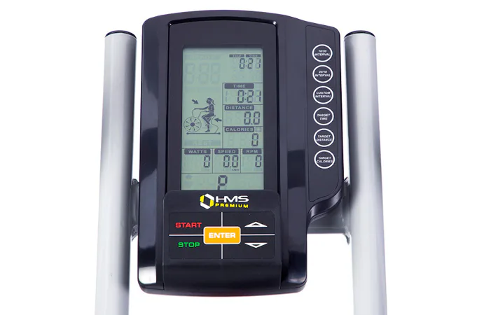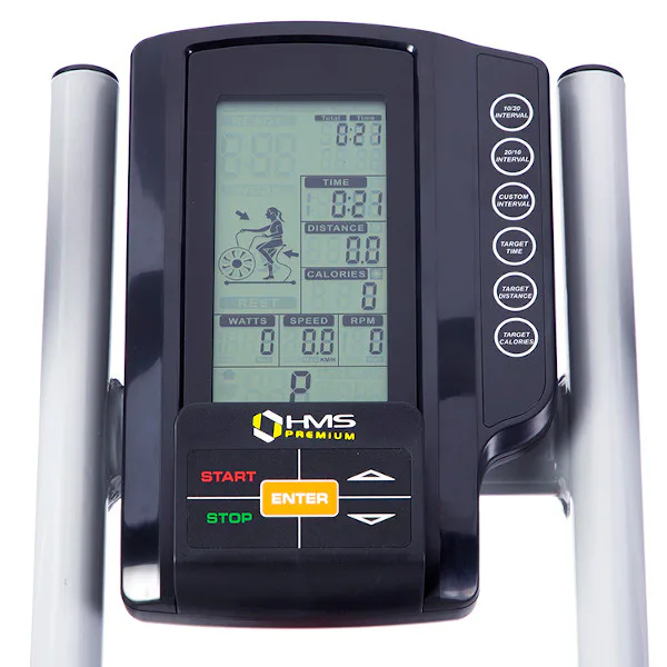 Air Bike HMS Premium MP8880 je nejkomplexnější stoj určený k vytrvalostnímu, silovému a kardio tréninku. Pohyblivá madla zapojují do tréninku ruce, díky tomu je jízda na Air Biku náročnější a zapojuje do práce větší část těla, než běžný rotoped. Na konstrukci nalezneme také 2 stupačky, na které si položíme chodidla a Air Bike MP8880 můžeme roztáčet pouze rukama. Tato variabilita nám umožňuje 3 druhy tréninku - pouze nohy, pouze ruce, celé tělo. Trenažér je také vybaven 4,6 kilogramovým zátěžovým kolem, které má na starosti plynulost pohybu a vyrovnávání slepých úhlů během pohybu choditel.