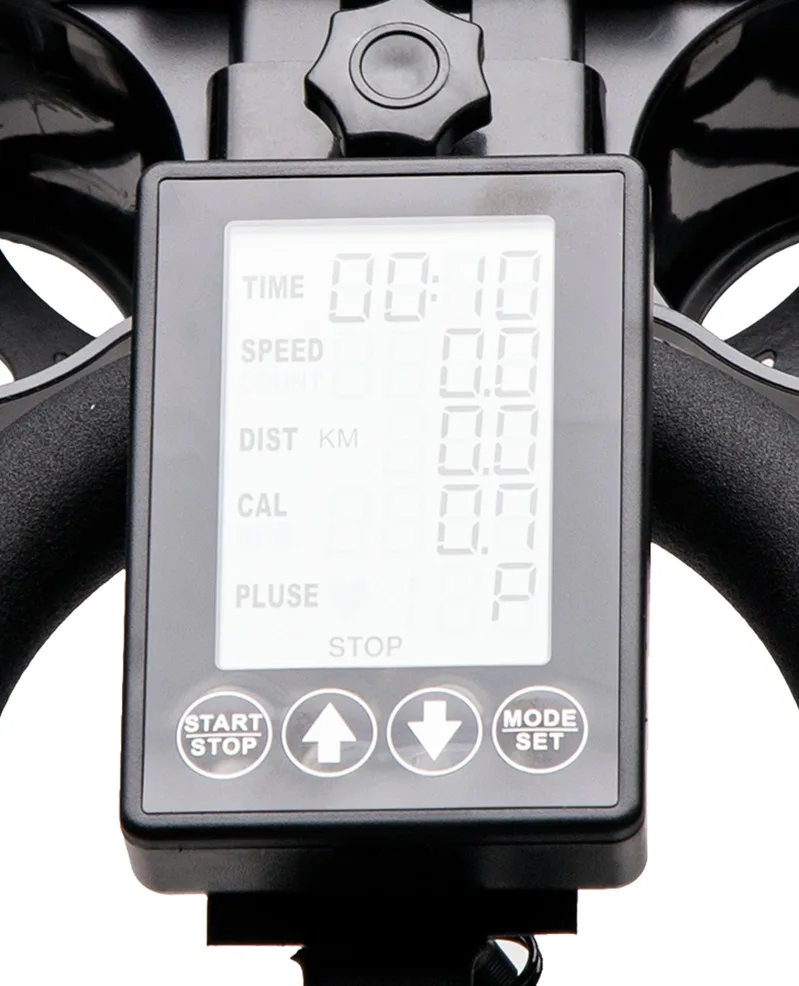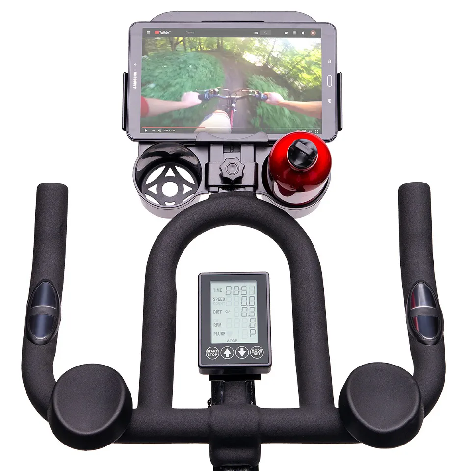 Veliký a přehledný displej počítače zobrazuje veškeré údaje přehledně pod sebou, takže již není potřeba se překlikávat přes jednotlivé hodnoty. Počítač navíc disponuje rozhraním Bluetooth pro spojení s mobilní aplikací, ve které můžete sledovat své tréninky a postupy. Konzole na řídítkách umožňuje odložení mobilního telefonu nebo tabletu a až dvou láhví.