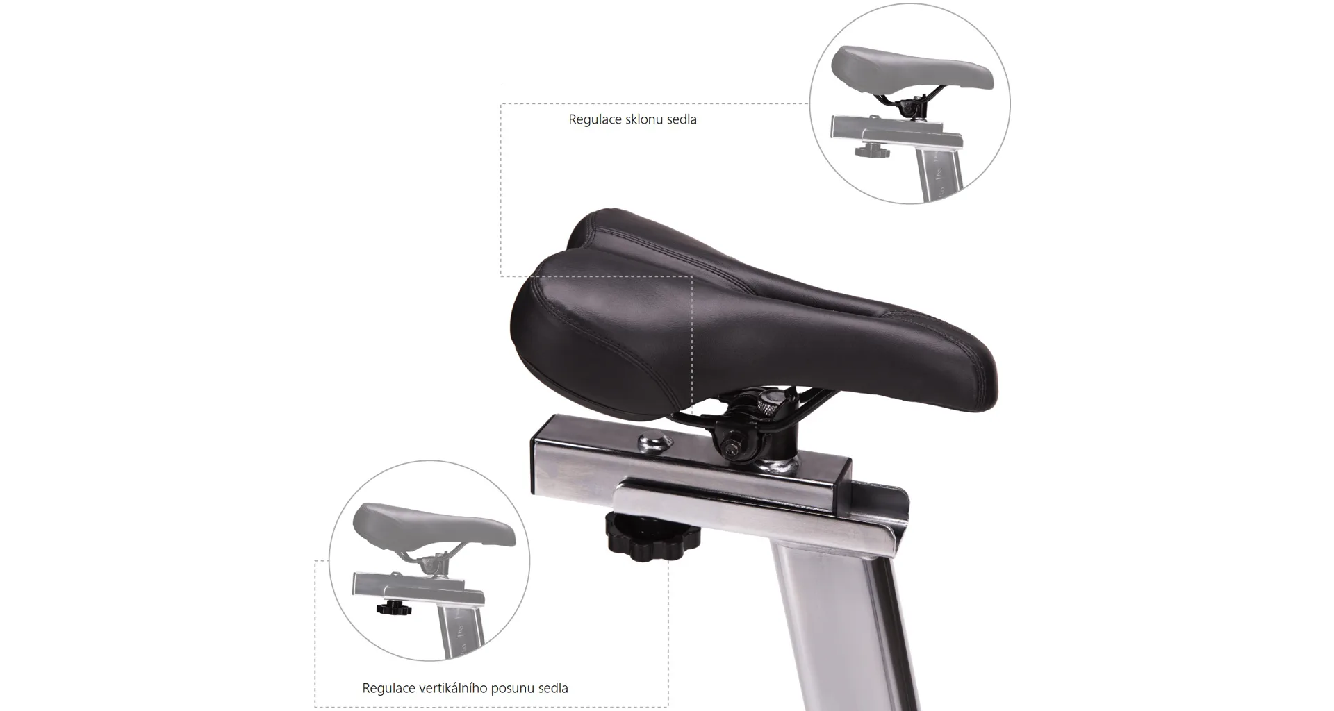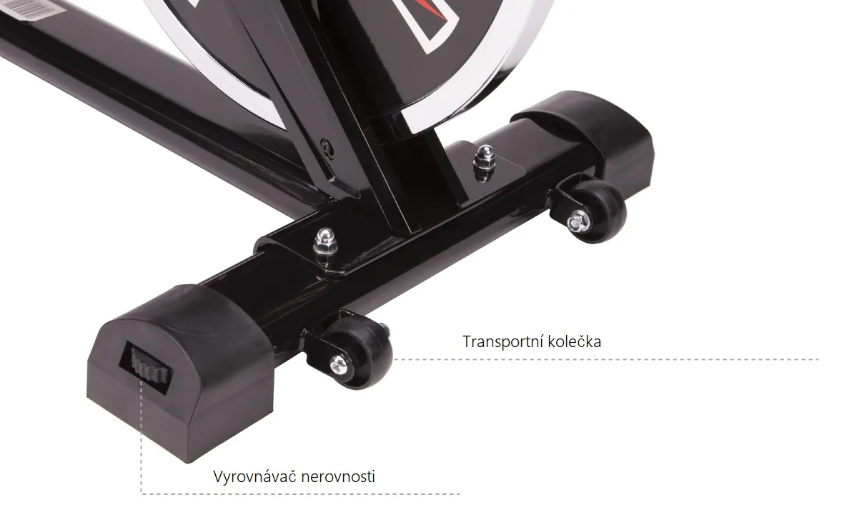 Zátěžové kolo má hmotnost 15 kilogramů. Odpor je generován přítlačnou brzdou, která je plynule nastavitelná pomocí mechanického regulátoru pod řídítky. Pro maximální komfort během tréninku jsou řídítka opatřeny loketními opěrkami a sedlo na odpružené části rámu je ergonomicky tvarované s ventilačním otvorem. Řídítka i sedlo jsou polohovatelné ve vertikálním i horizontálním směru. Ocelové pedály jsou osazeny klasickými košíky s nastavitelným řemínkem, které zajišťují pevnou polohu chodidla.