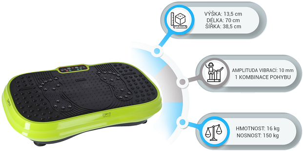 Rozměry vibrační plošiny jsou (dxšxv): 70 x 38,5 x 13,5 cm a hmotnost 16 kg, takže není problém ji pohodlně uložit pod postel apod., aby nezabírala zbytečný prostor.