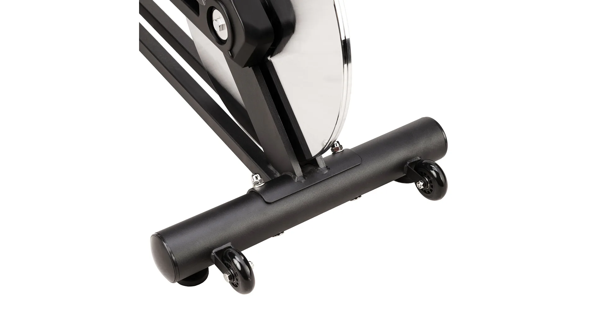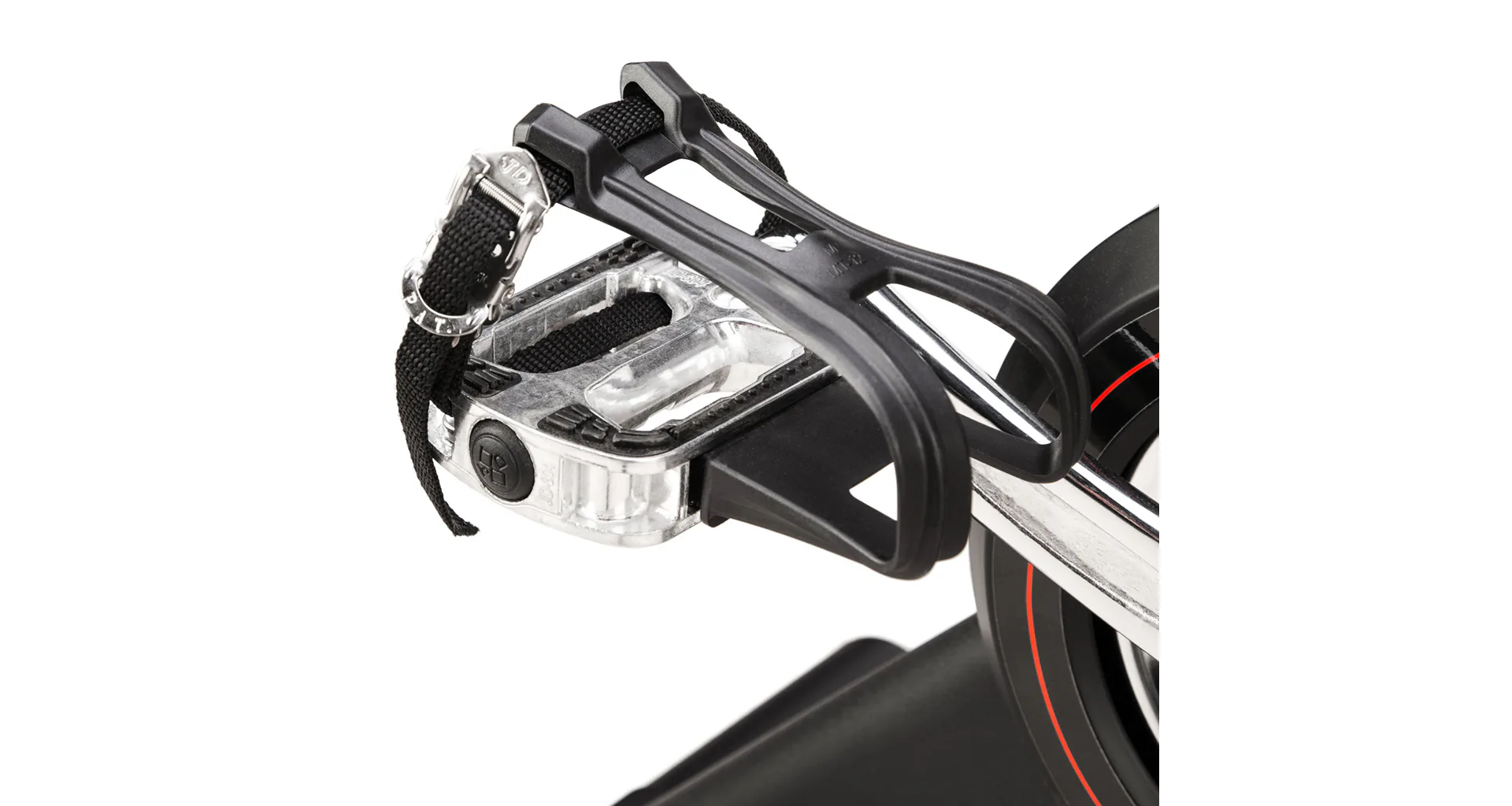 Ocelové pedály jsou osazeny košíky s nastavitelným řemínkem, toto řešení umožňuje použití jakékoliv boty. Přední stabilizátor s transportními kolečky umožňuje snadné přesouvání a uskladnění trenažéru, pokud právě není využíván. Oba stabilizátory jsou pak opatřeby výškově nastavitelnými šrouby pro vyrovnání třenažéru do roviny i na nerovné podlaze.
