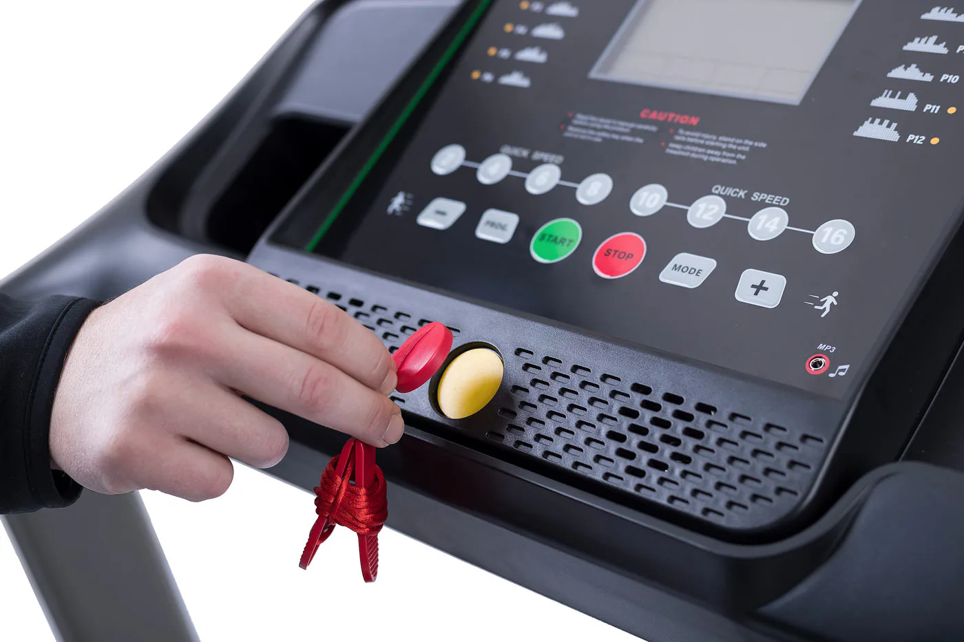 Dále nabízí možnost připojení MP3 pro poslech hudby prostřednictvím vestavěných reproduktorů, 2 držáky na láhev s vodou a bezpečnostní pojistku pro okamžité zastavení pásu.