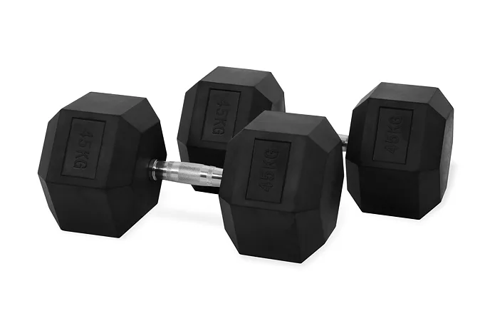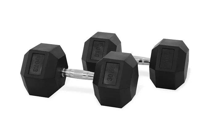 Dobrý den, HEXA činky TRINFIT jsou ještě poctivé a klasicky ze železa (litinové) s pogumovaným povrchem :-).