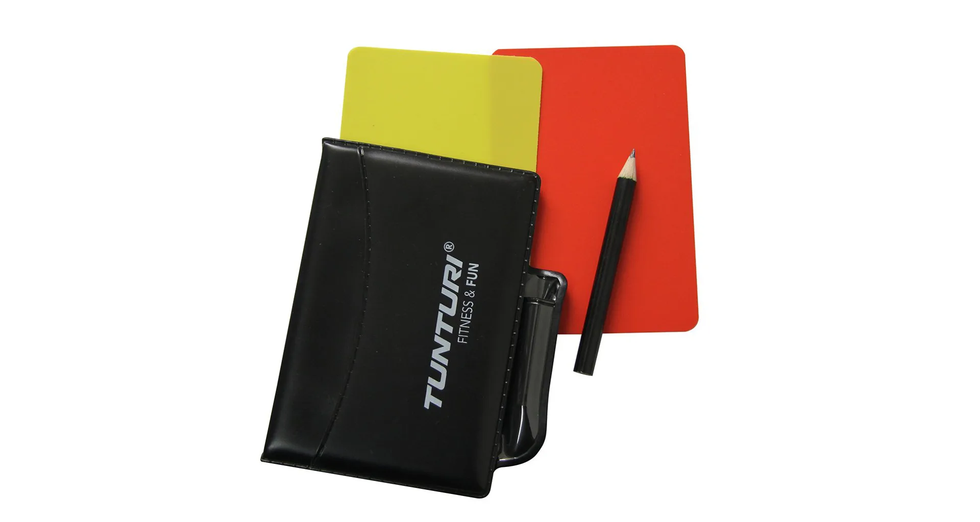 Karty pro rozhodčí Cards Set TUNTURI je pomůcka pro rozhodčí míčových her. Set obsahuje červenou a žlutou kartu s obalem + tužku pro zápis.
