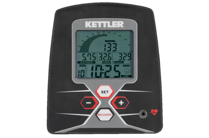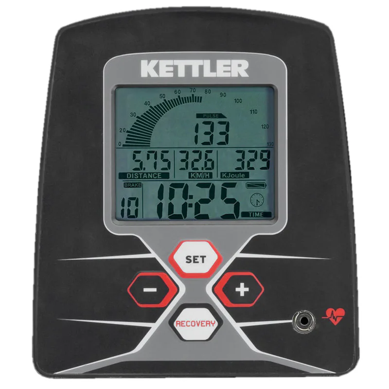 Přehledný LCD displej se 7 permanentně zobrazovanými funkcemi měří čas, rychlost, tréninkovou vzdálenost (včetně celkového počtu ujetých km), puls, frekvenci šlapání a spotřebu energie. Optická i akustická signalizace při překročení horní hranice pulsu spolu se zobrazením procentuálního údaje.
