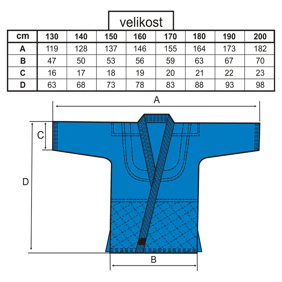 Kimono pro Judo vyšší třídy v modré barvě určené pro trénink i turnaje. Vhodné pro Judo, Jiu-Jitsu a Aikido. Kimono je zesílené a vícenásobné prošité na ramenech, pod paží a ve spojích. V límci je použita výztuha z bavlny. Kalhoty jsou v oblasti kolen zesíleny dvěma vrstvami a v pase s tkanicí pro pevné stažení.