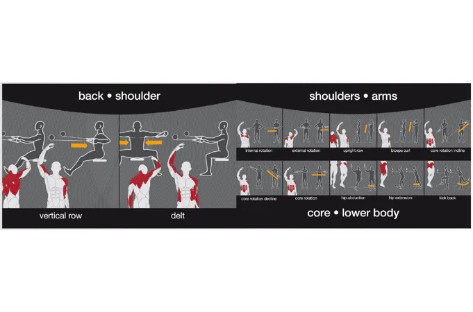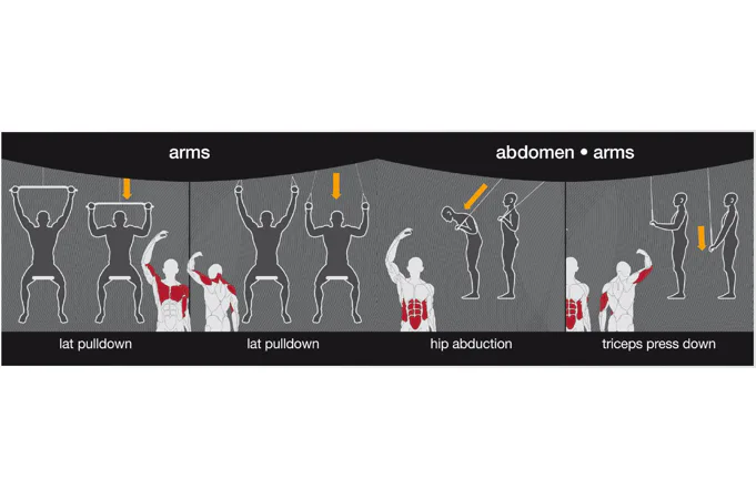 BH FITNESS L480 umožňuje procvičení desítek cviků na celé tělo např. stahování horní kladky, cviky na ramena, zanožování, veslování, cviky na břišní svalstvo apod..