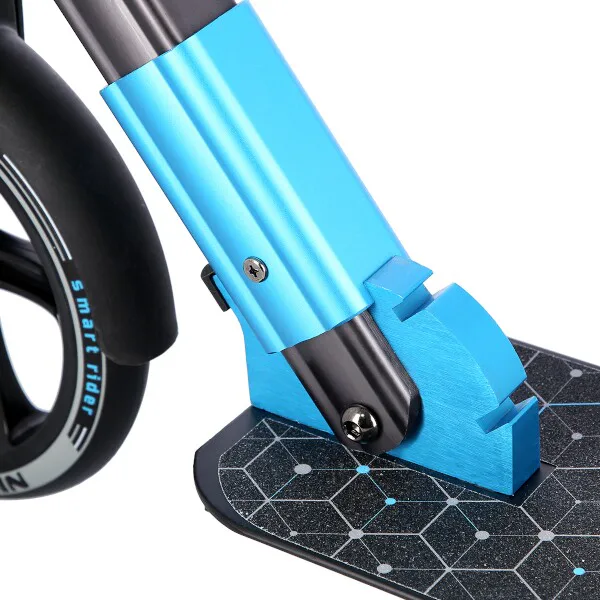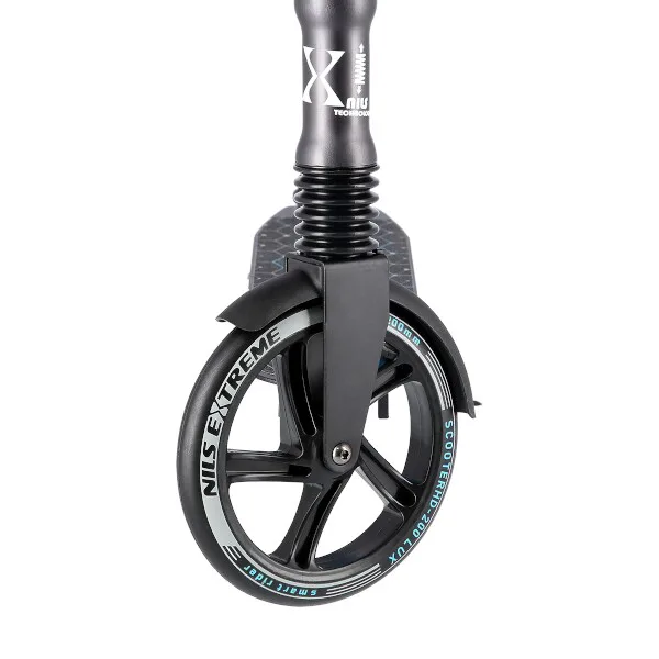 Koloběžka NILS Extreme HM200 je vhodná pro děti i dospělé. Charakteristikou modelu HM200 jsou tlumiče na předním i zadním kole, široká řídítka a výklopný stojánek.Skládací hliníková konstrukce je lehká, pevná a po složení není problém s koloběžkou cestovat například v autobuse, nebo tramvaji. HM200 se také snadno vejde do kufru osobního automobilu, kde nezabere moc místa a můžete si ji tak vzít s sebou například na dovolenou.Systém odpružení obou kol zvyšuje jízdní komfort. Tlumiče pohlcují nárazy a jízda po nerovném asfaltu, nebo dlažebních kostkách je příjemnější a tišší. Robustní zadní blatník slouží jako přítlačná brzda. Široká řídítka jsou opatřena gumovými rukojeťmi, které zajišťují pevný a pohodlný úchop. 200 milimetrů velká kola jsou osazena ložisky ABEC 7. Tato kombinace zajišťuje rychlou, plynulou a bezpečnou jízdu. Blatník na předním kole a skládací stojánek jsou drobnostmi, které přispívají k maximálnímu možnému komfortu z jízdy a k celkové radosti ze samotného používání modelu MH200.