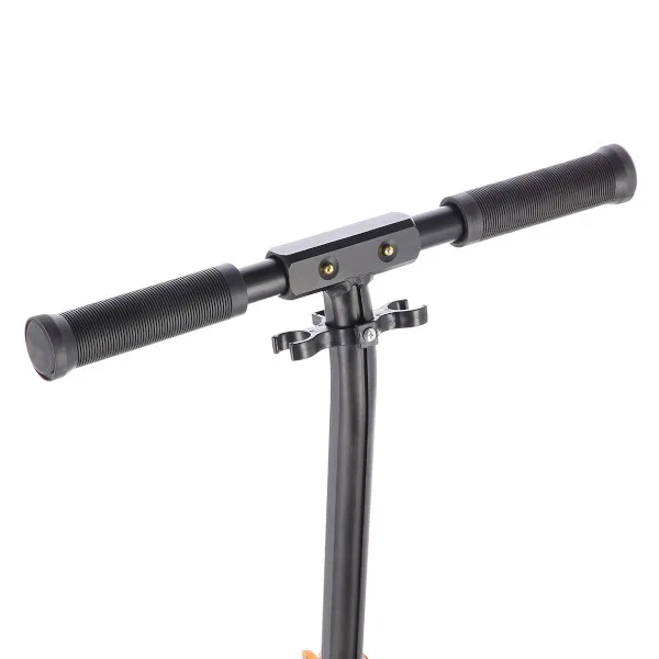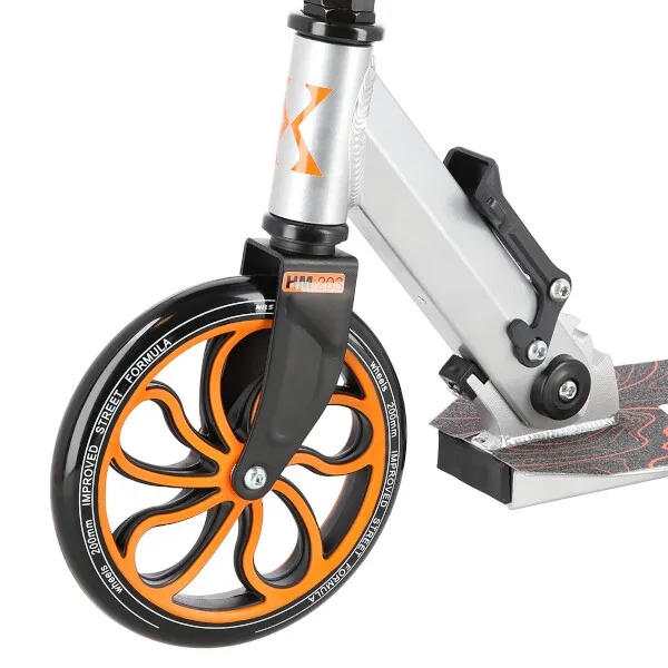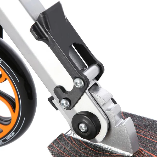 Skládací hliníková konstrukce je lehká, pevná a po složení není problém s koloběžkou cestovat například v autobuse, nebo tramvaji. HM203 se také snadno vejde do kufru osobního automobilu, kde nezabere moc místa a můžete si ji tak vzít s sebou například na dovolenou. Zadní blatník slouží jako přítlačná brzda. Široká řídítka jsou opatřena gumovými rukojeťmi, které zajišťují pevný a pohodlný úchop. 200 milimetrů velká kola jsou osazena ložisky ABEC 7. Tato kombinace zajišťuje rychlou, plynulou a bezpečnou jízdu. Blatník na předním kole a skládací stojánek jsou drobnostmi, které přispívají k maximálnímu možnému komfortu z jízdy a k celkové radosti ze samotného používání modelu MH203.