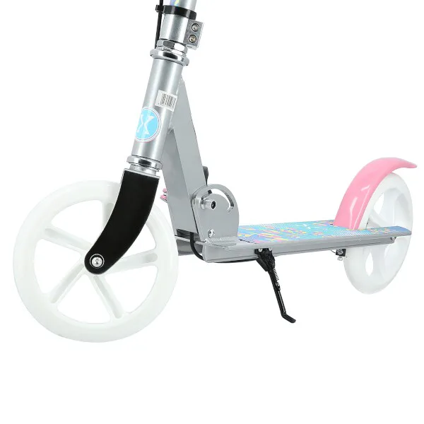 Zadní blatník slouží jako nožní, přítlačná brzda, pod blatníkem se skrývá samostatná, malá brzda, která je ovládána páčkou z řídítek. Řídítka jsou opatřena gumovými rukojeťmi, které zajišťují pevný a pohodlný úchop. Velká kola jsou osazena ložisky ABEC 7. Tato kombinace zajišťuje plynulou a bezpečnou jízdu. Na levé straně nášlapu se nachází sklopný stojánek.
