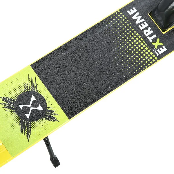 Koloběžka NILS Extreme HM220 je vhodná pro děti i dorost. Skládací hliníková konstrukce je lehká, pevná a po složení není problém s koloběžkou cestovat například v autobuse, nebo tramvaji. HM220 se také snadno vejde do kufru osobního automobilu, kde nezabere moc místa a můžete si ji tak vzít s sebou například na dovolenou.Zadní blatník slouží jako nožní, přítlačná brzda, pod blatníkem se skrývá samostatná, malá brzda, která je ovládána páčkou z řídítek. Řídítka jsou opatřena gumovými rukojeťmi, které zajišťují pevný a pohodlný úchop. Velká kola jsou osazena ložisky ABEC 7. Tato kombinace zajišťuje plynulou a bezpečnou jízdu. Na levé straně nášlapu se nachází sklopný stojánek.