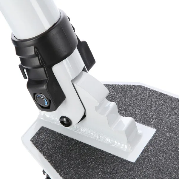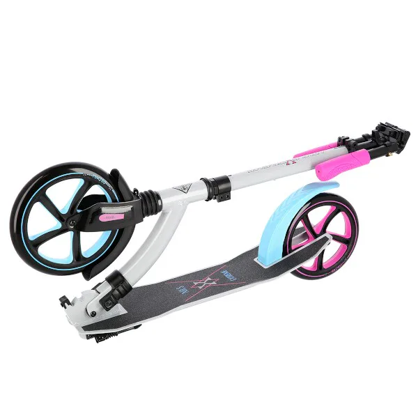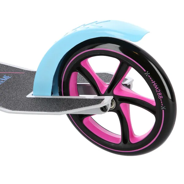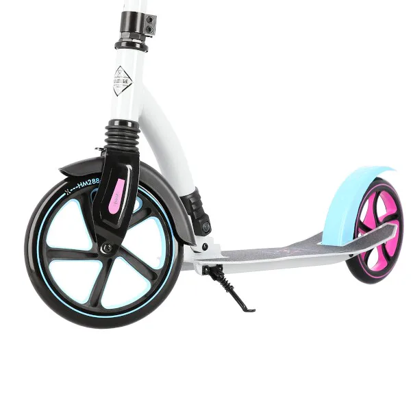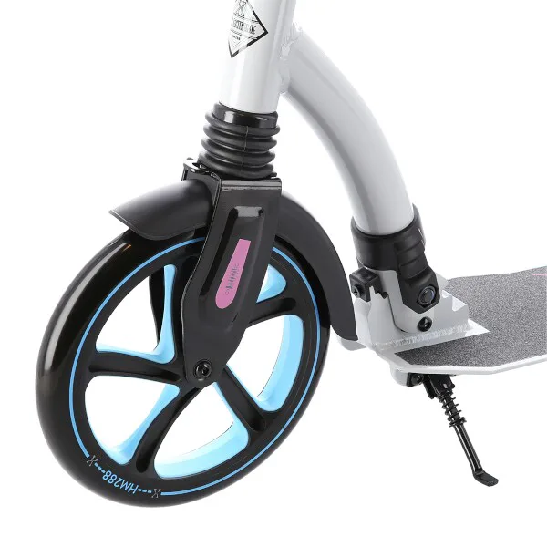 Systém odpružení předního kola zvyšuje jízdní komfort. Tlumič pohlcuje nárazy a jízda po nerovném asfaltu, nebo dlažebních kostkách je příjemnější a tišší. Zadní blatník slouží jako přítlačná brzda. Řídítka jsou opatřeny gumovými rukojeťmi, které zajišťují pevný a pohodlný úchop. Velká kola s průměrem 230 milimetrů ve předu a 200 milimetrů vzadu jsou osazena ložisky ABEC 9 pro plynulou a bezpečnou jízdu. Blatník na předním kole ochrání před stříkající vodou a bahnem.