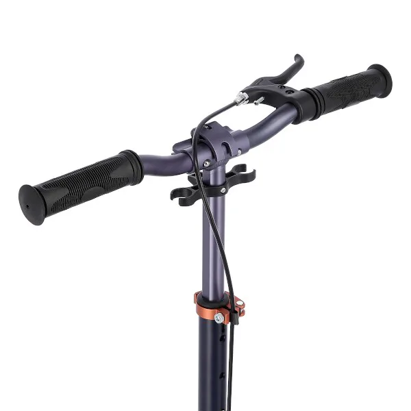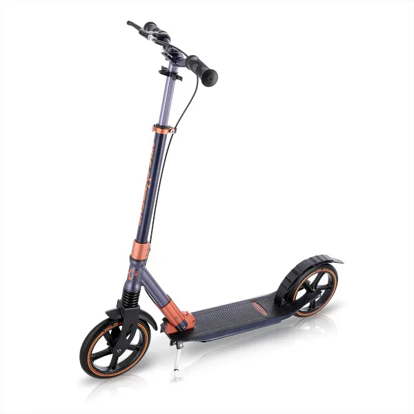 Koloběžka NILS Extreme HM230 je vhodná pro děti i dospělé. Charakteristikou modelu HM230 je tlumič na předním kole, široká řídítka, ručně ovládaná brzda a výklopný stojánek. Skládací hliníková konstrukce je lehká, pevná a po složení není problém s koloběžkou cestovat například v autobuse, nebo tramvaji. HM230 se také snadno vejde do kufru osobního automobilu, kde nezabere moc místa a můžete si ji tak vzít s sebou například na dovolenou.Systém odpružení předního kola zvyšuje jízdní komfort. Tlumič pohlcuje nárazy a jízda po nerovném asfaltu, nebo dlažebních kostkách je příjemnější a tišší. Robustní zadní blatník slouží jako nožní, přítlačná brzda, pod blatníkem se skrývá samostatná, malá brzda, která je ovládána páčkou z řídítek. Široká řídítka jsou opatřena gumovými rukojeťmi, které zajišťují pevný a pohodlný úchop. 230 milimetrů velká kola jsou osazena ložisky ABEC 7. Tato kombinace zajišťuje rychlou, plynulou a bezpečnou jízdu. Blatník na předním kole a skládací stojánek jsou drobnostmi, které přispívají k maximálnímu možnému komfortu z jízdy a k celkové radosti ze samotného používání modelu MH230.