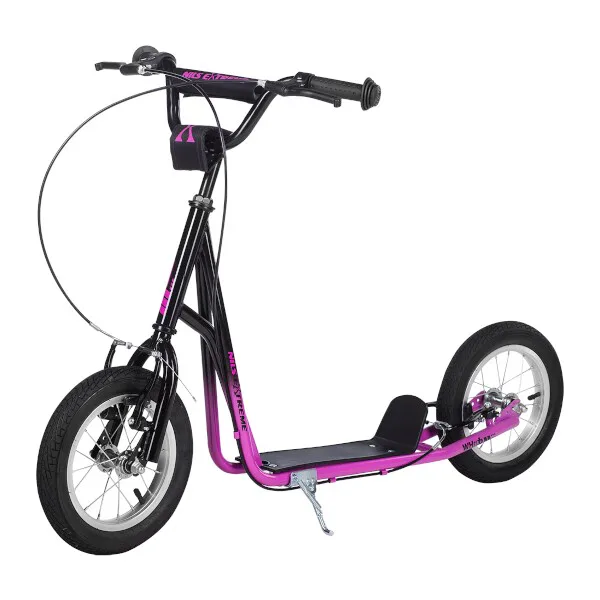 Koloběžka NILS Extreme WH117BN má nosnost 80 kilogramů a je tak určená pro děti a dorost. Rám, vidlice a řídítka jsou vyrobeny z kvalitní oceli. 12", hliníkové ráfky jsou obuty pumpovanými pneumatikami, které zaručují vysoký jízdní komfort a snadné překonávání drobných nerovností. Model WH117BN je tedy ideální volbou pro jízdu po asfaltových silnicích, dlážděných městských uličkách, ale i po lesních stezkách.WH117BN je opatřena přední a zadní brzdou typu "V-Brake", sklopným stojánkem a molitanovým chráničem na trubce řídítek. Gumové gripy zajišťují pevný a pohodlný úchop.