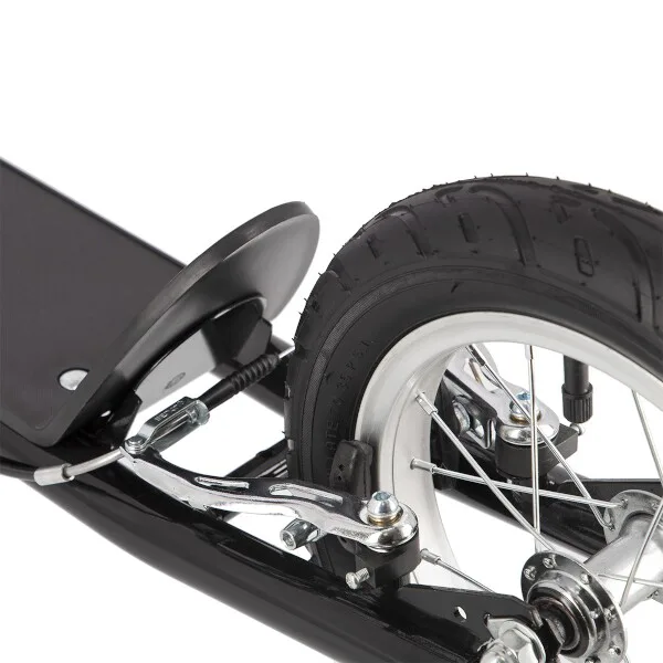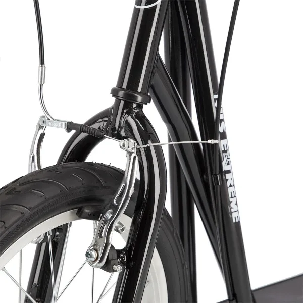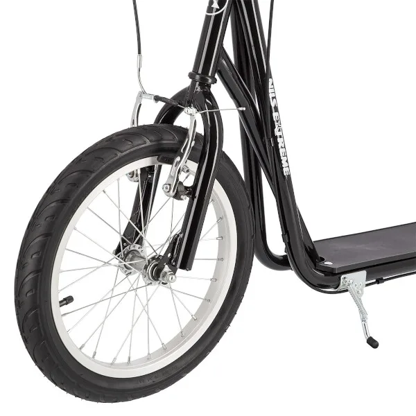 Koloběžka NILS Extreme WH118A má nosnost 80 kilogramů a je tak určená pro děti a dorost. Rám, vidlice a řídítka jsou vyrobeny z kvalitní oceli. 16" a 12", hliníkové ráfky jsou obuty pumpovanými pneumatikami, které zaručují vysoký jízdní komfort a snadné překonávání drobných nerovností. Model WH118A je tedy ideální volbou pro jízdu po asfaltových silnicích, dlážděných městských uličkách, ale i po lesních stezkách.WH118A je opatřena přední a zadní brzdou typu "V-Brake", sklopným stojánkem a molitanovým chráničem na trubce řídítek. Gumové gripy zajišťují pevný a pohodlný úchop.